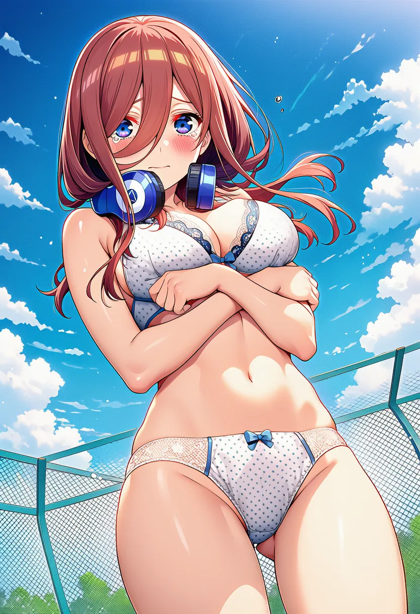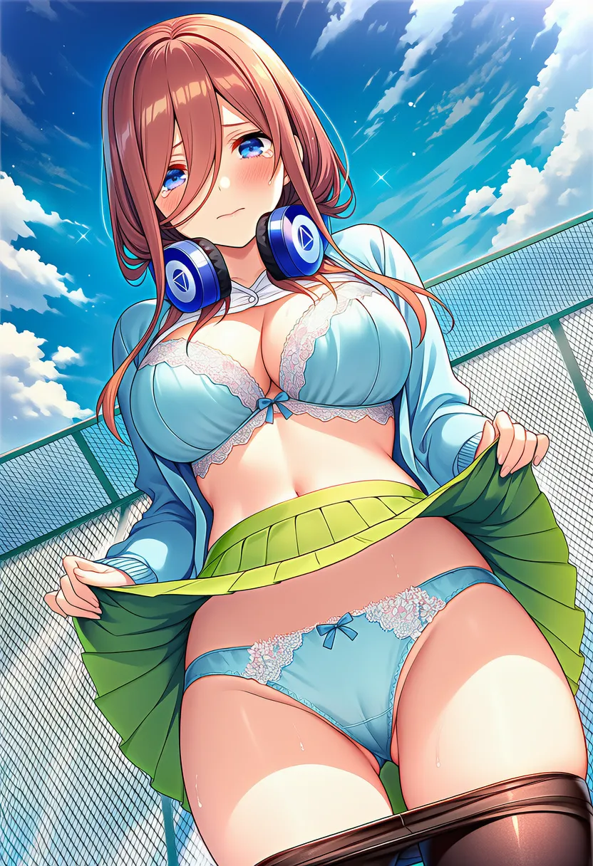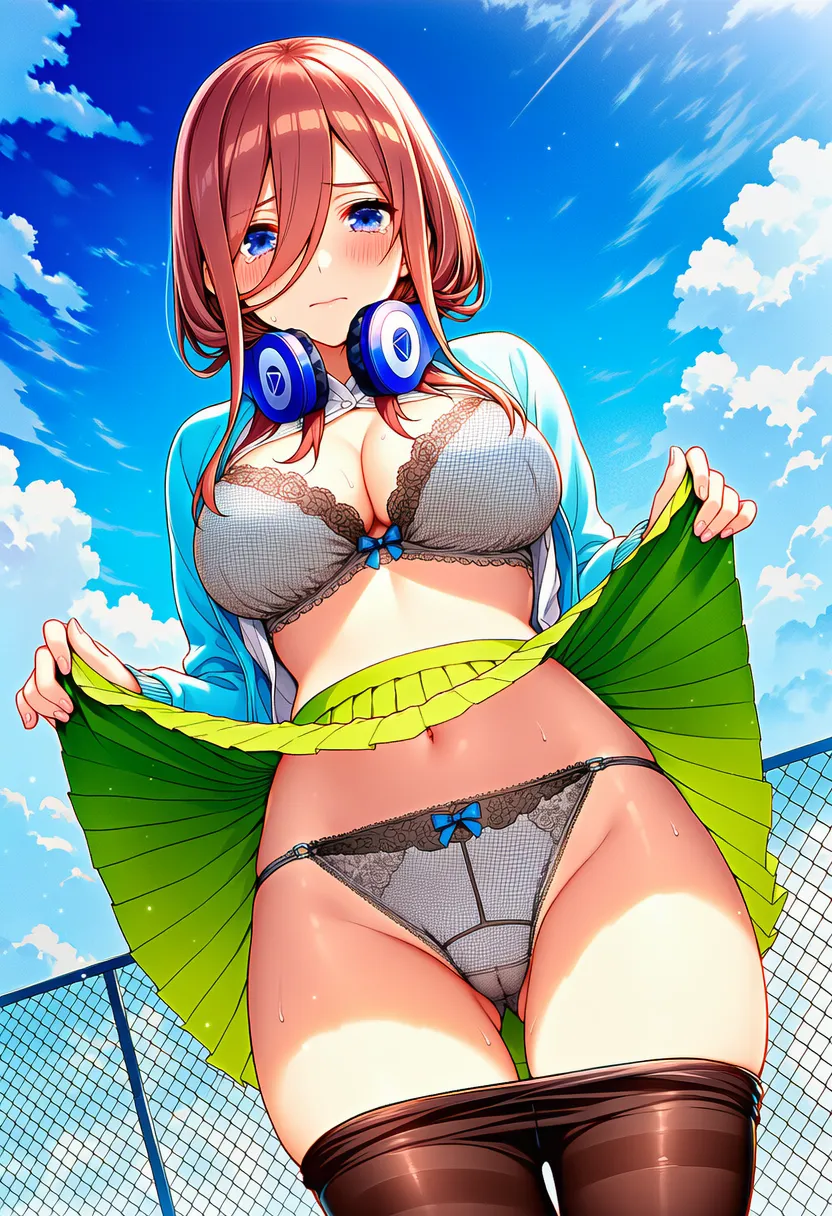 『五等分の花嫁』の中野三玖(なかの にの)の下着露出イラストです。pixivでは「下着チェック」シリーズとして投稿している内容です。クリック/タップで大きな画像を表示できます。