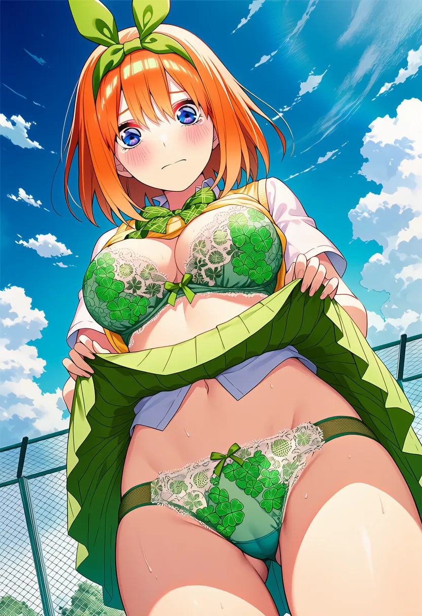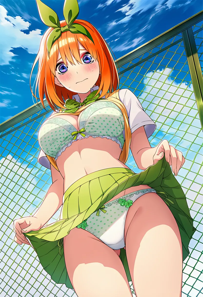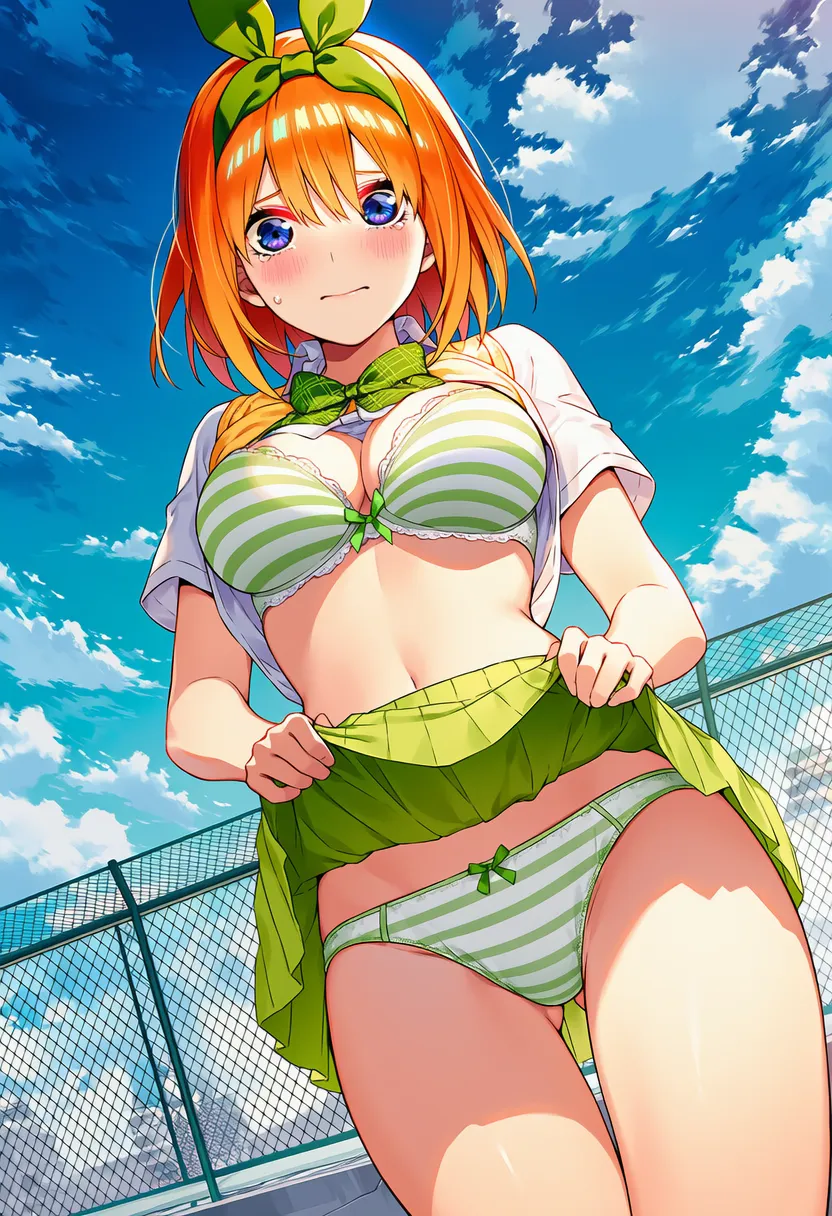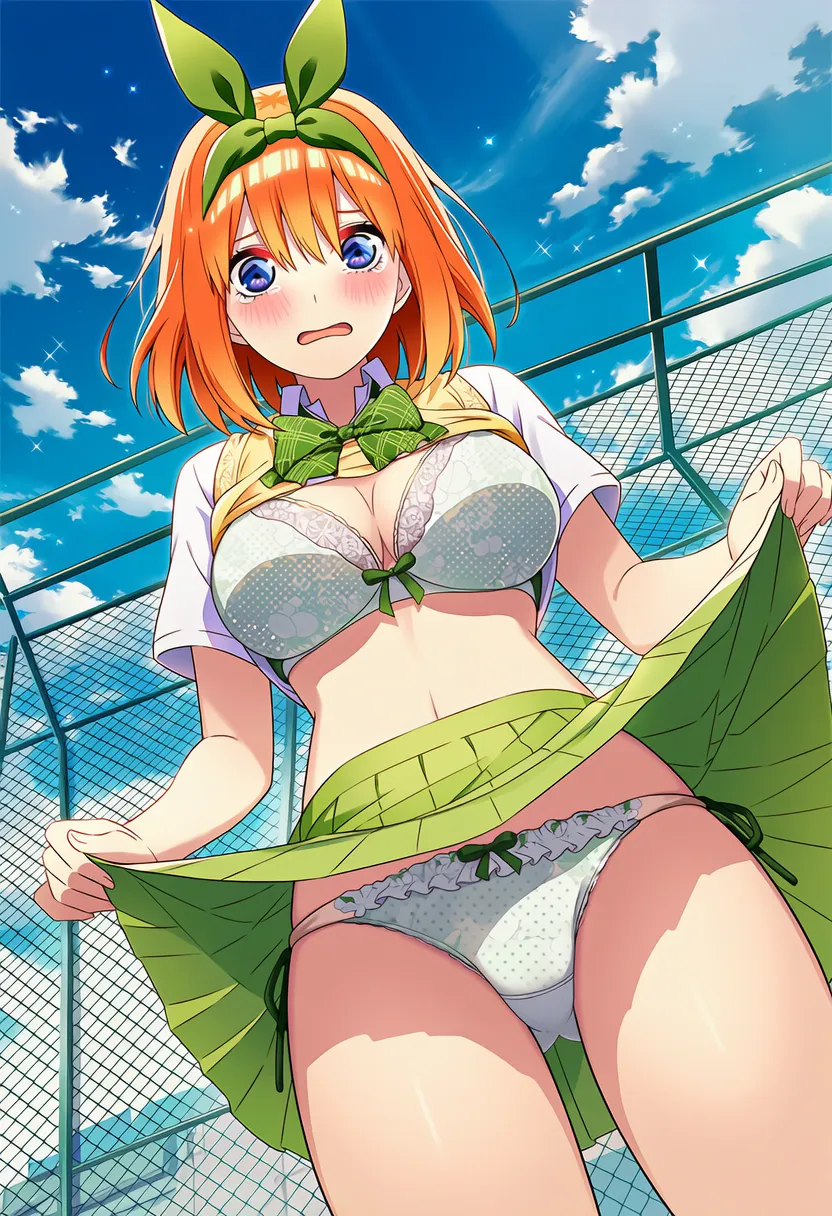 『五等分の花嫁』の中野四葉(なかの よつば)の下着露出イラストです。pixivでは「下着チェック」シリーズとして投稿している内容です。クリック/タップで大きな画像を表示できます。