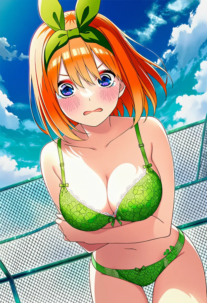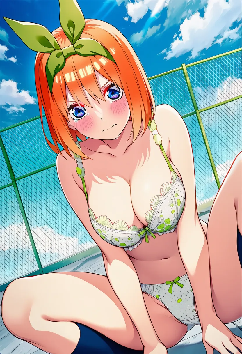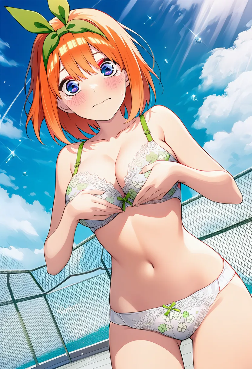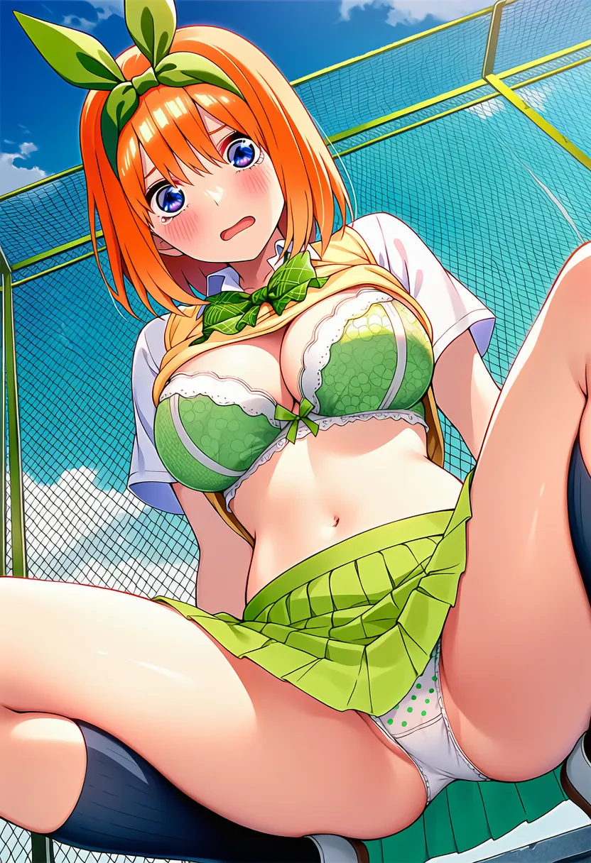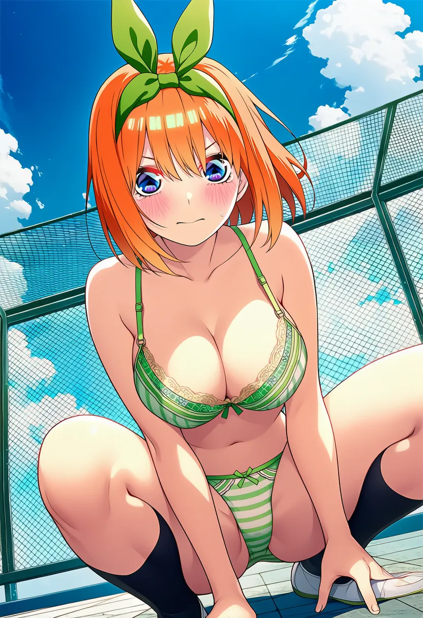 『五等分の花嫁』の中野四葉(なかの よつば)の下着露出イラストです。pixivでは「下着チェック」シリーズとして投稿している内容です。クリック/タップで大きな画像を表示できます。