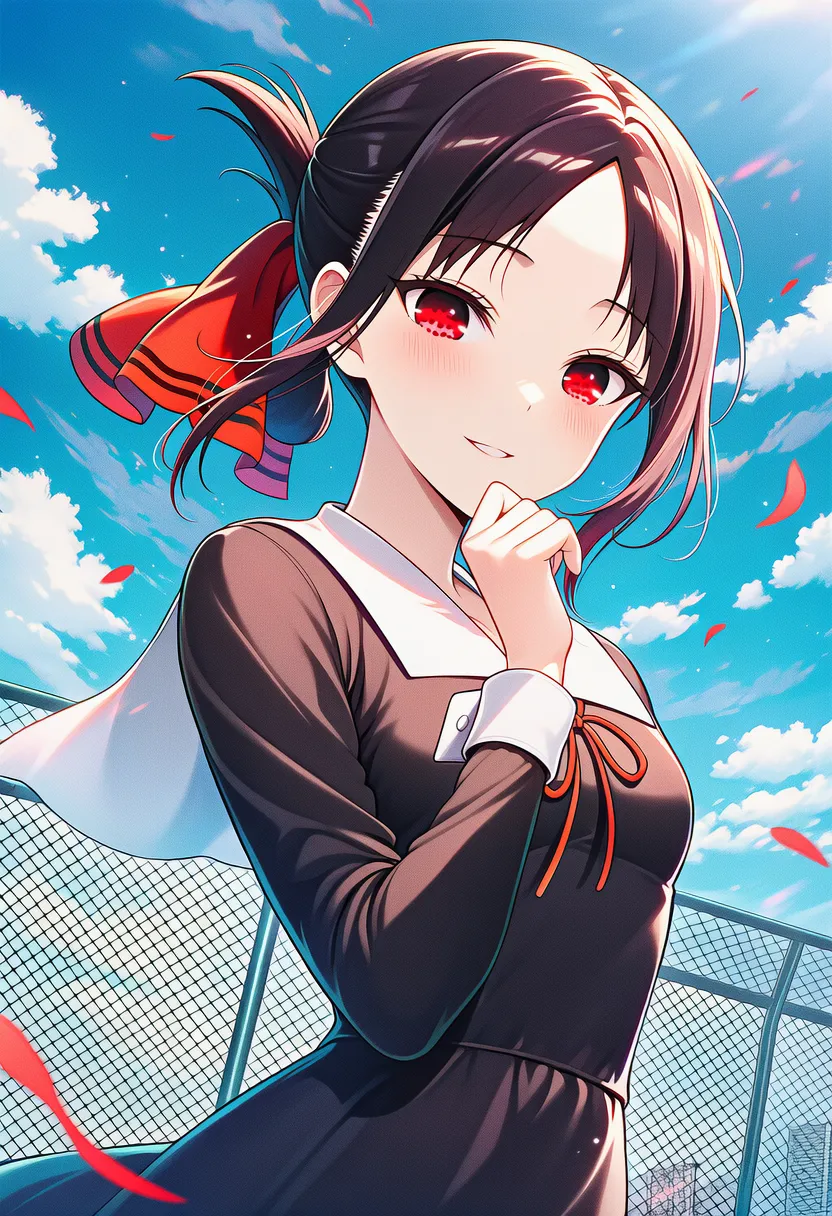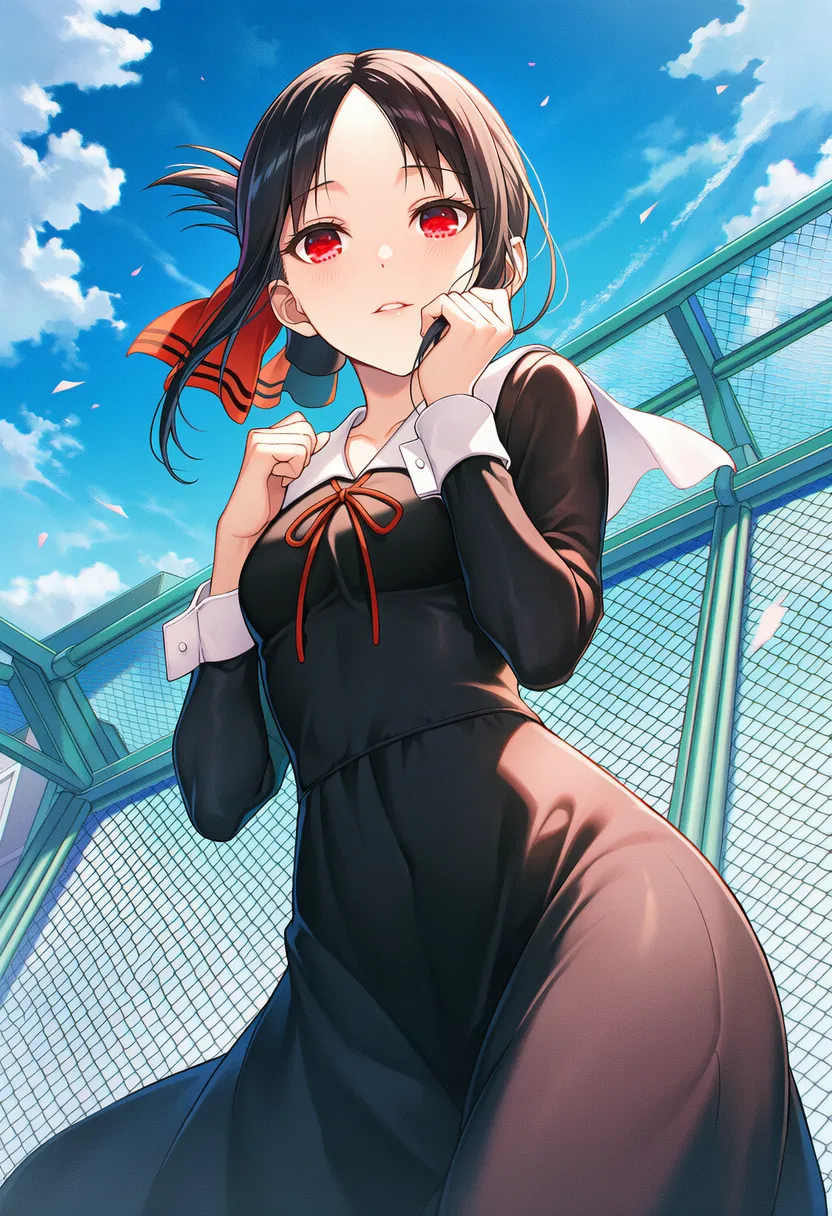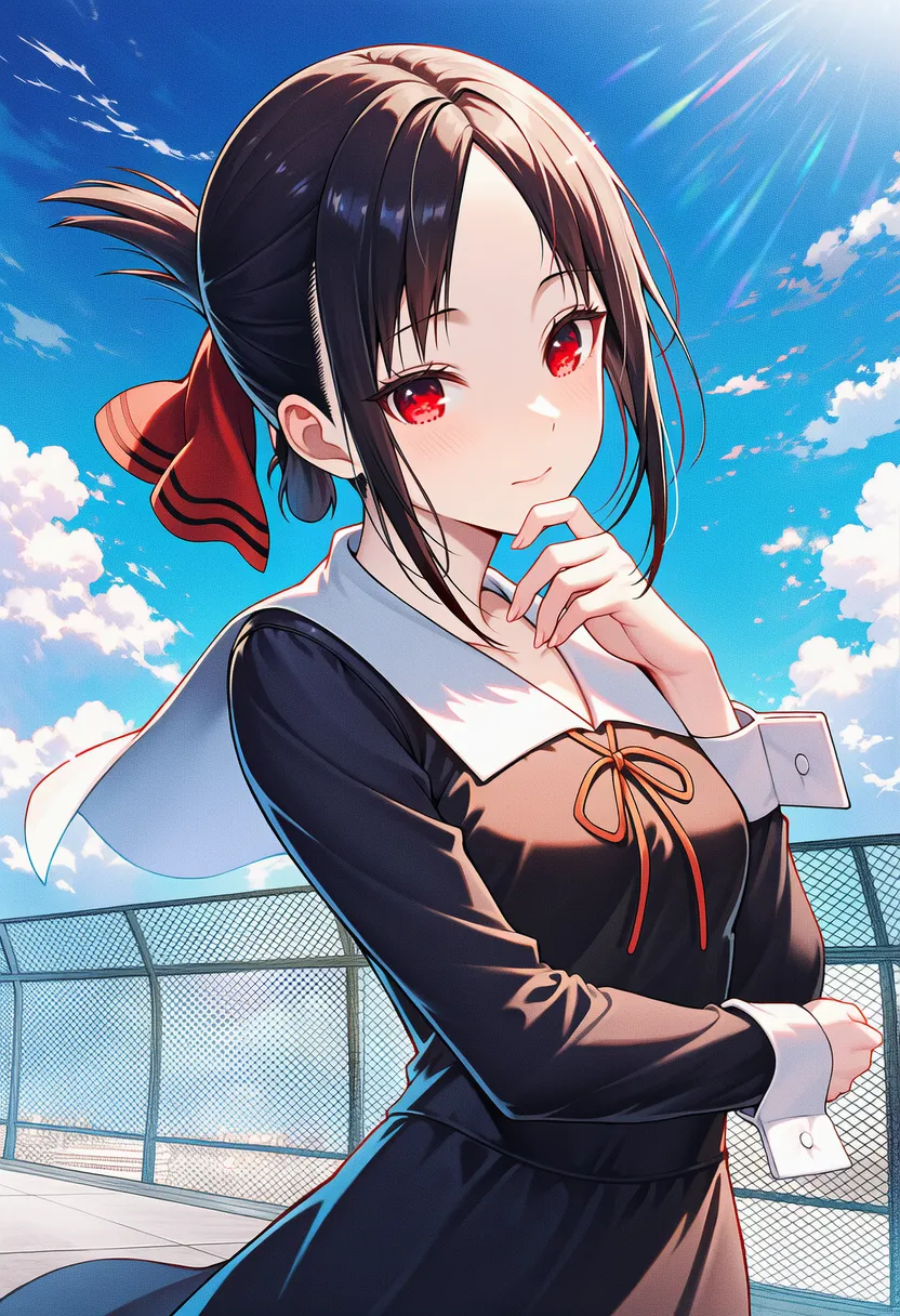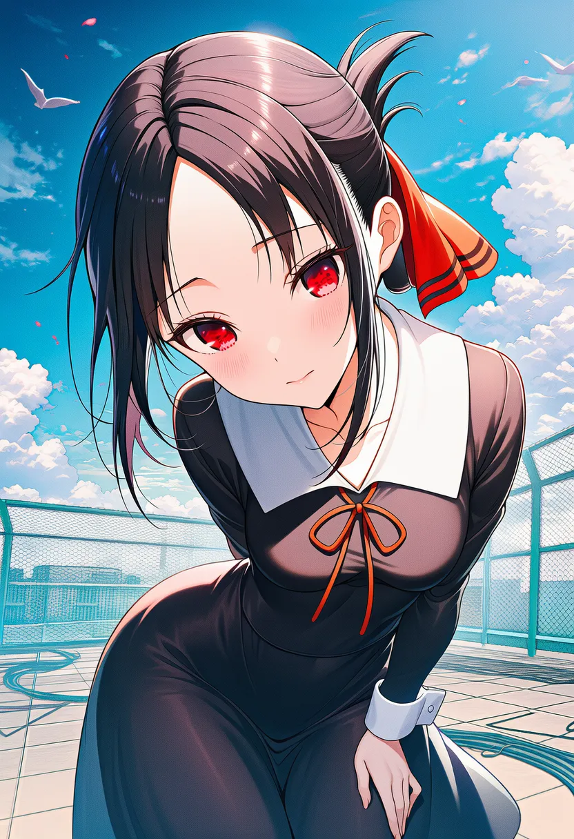 屋上にいる冬服姿の四宮かぐや、バストアップ。