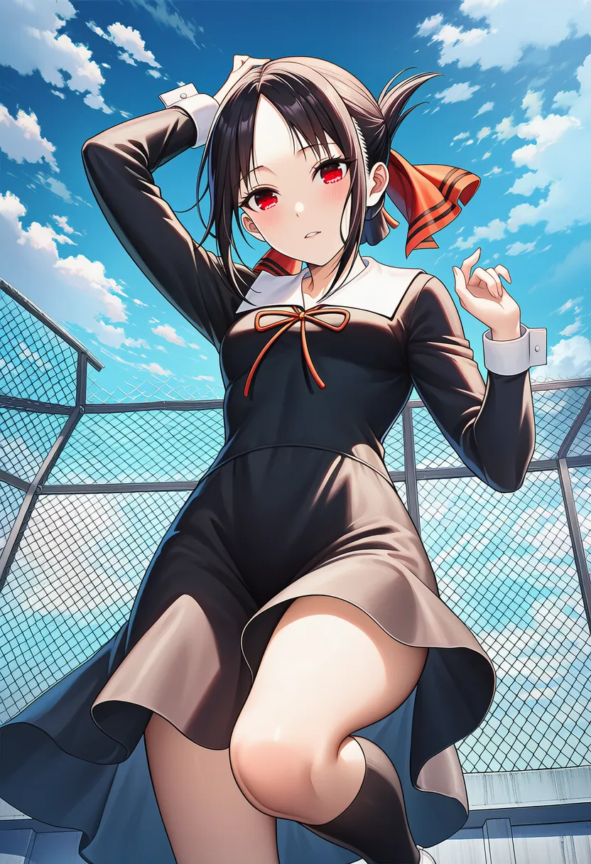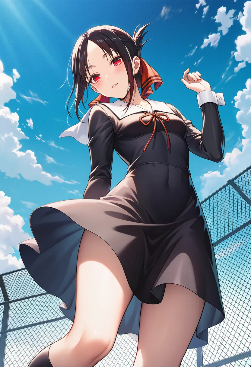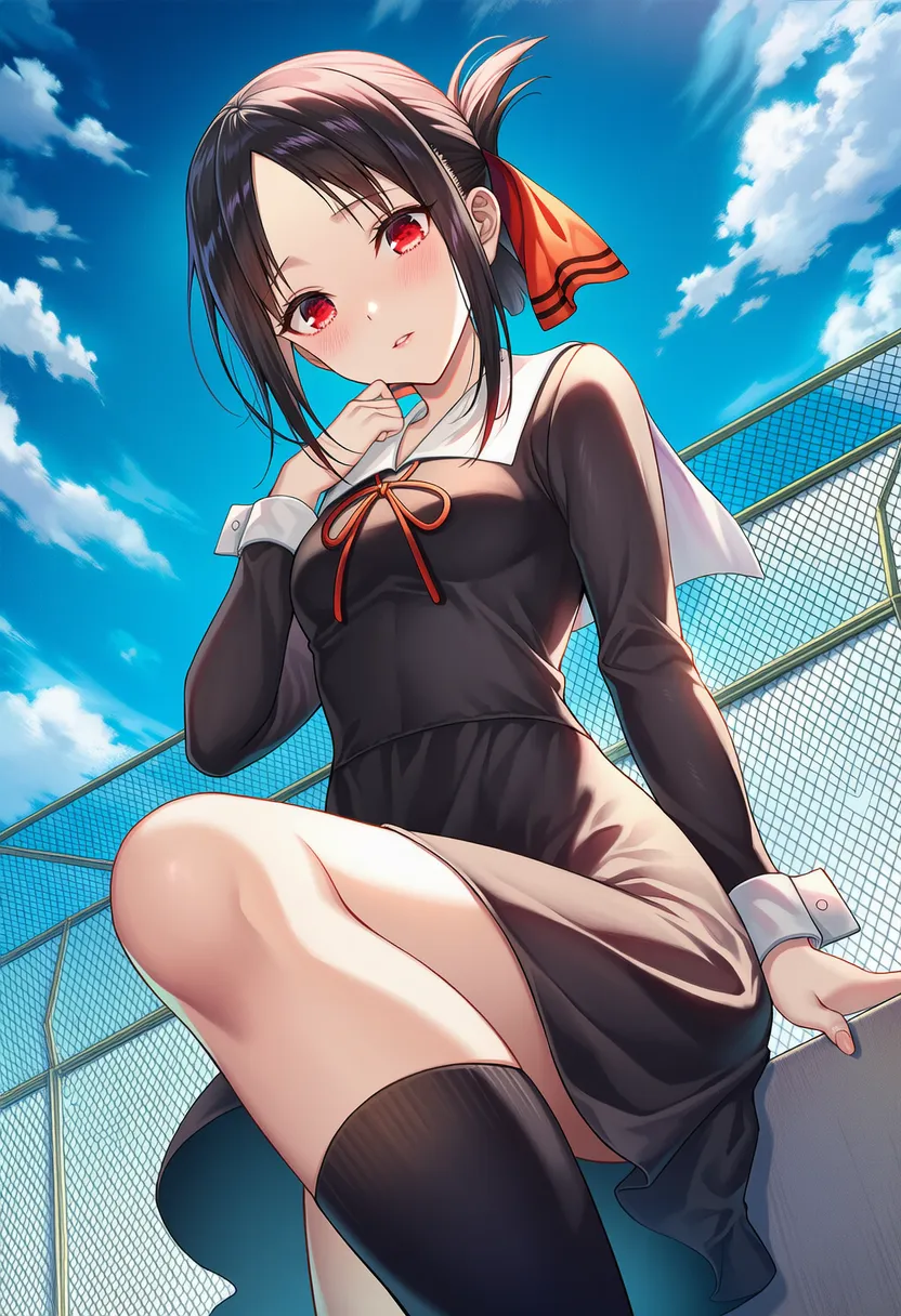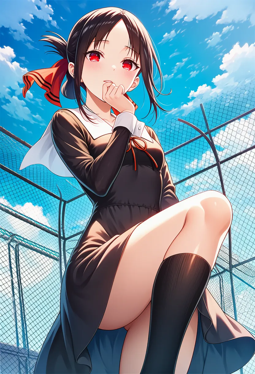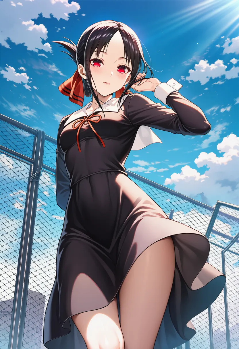 屋上にいる冬服姿の四宮かぐや、バストアップ。