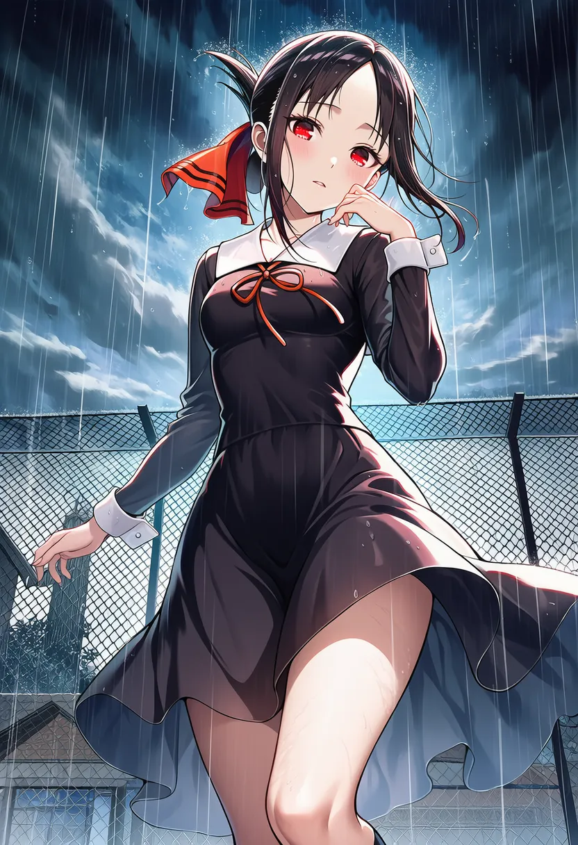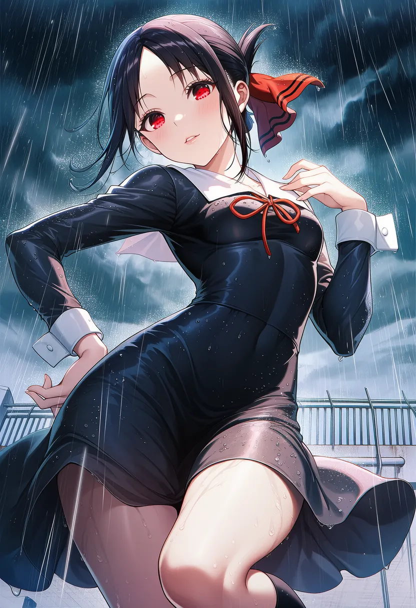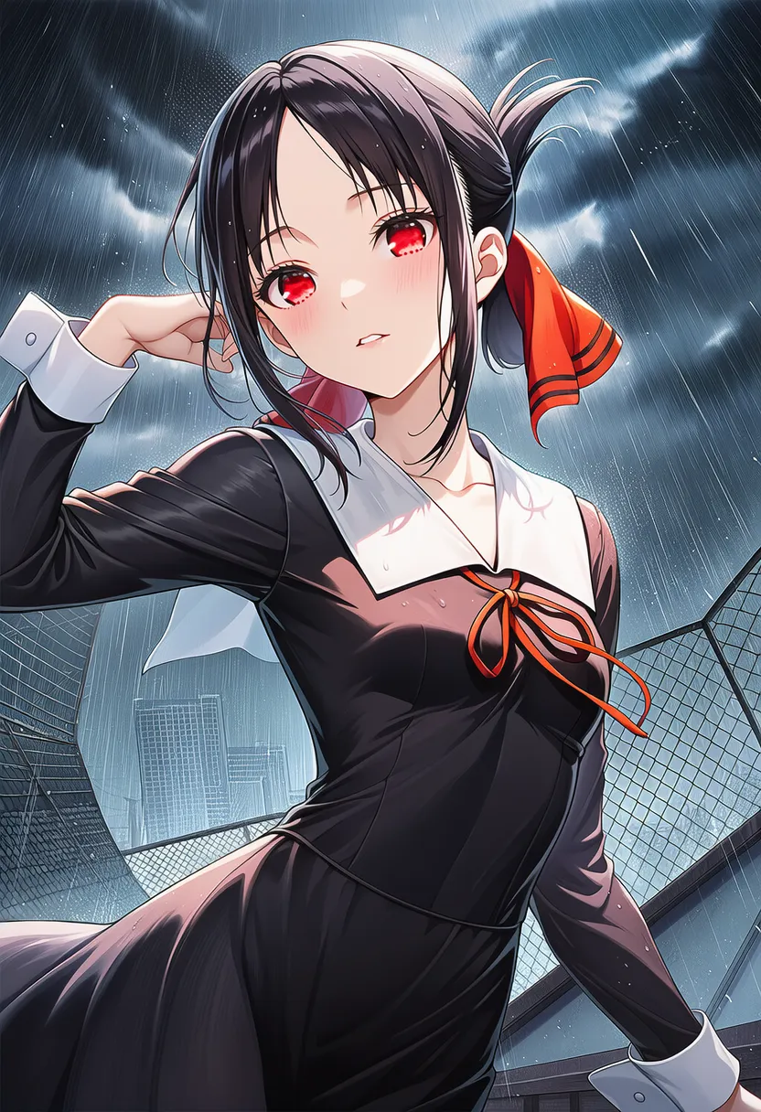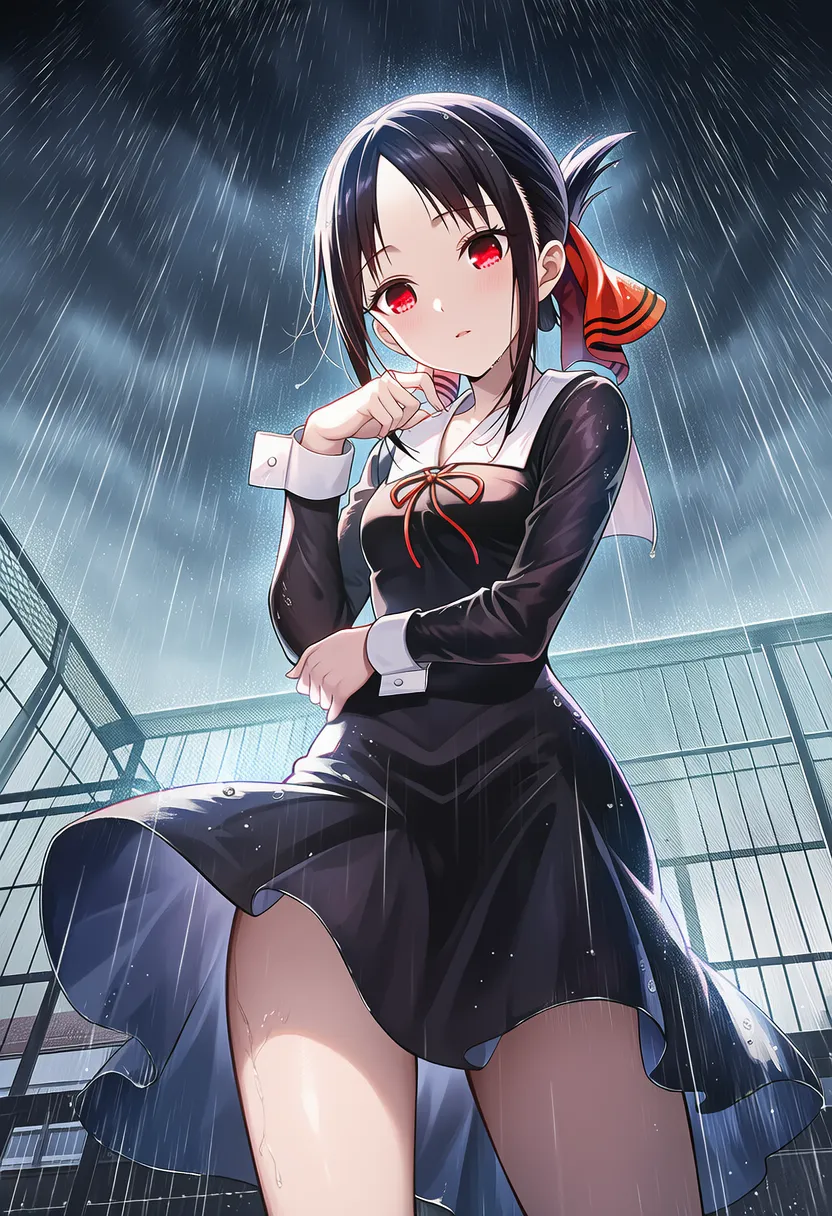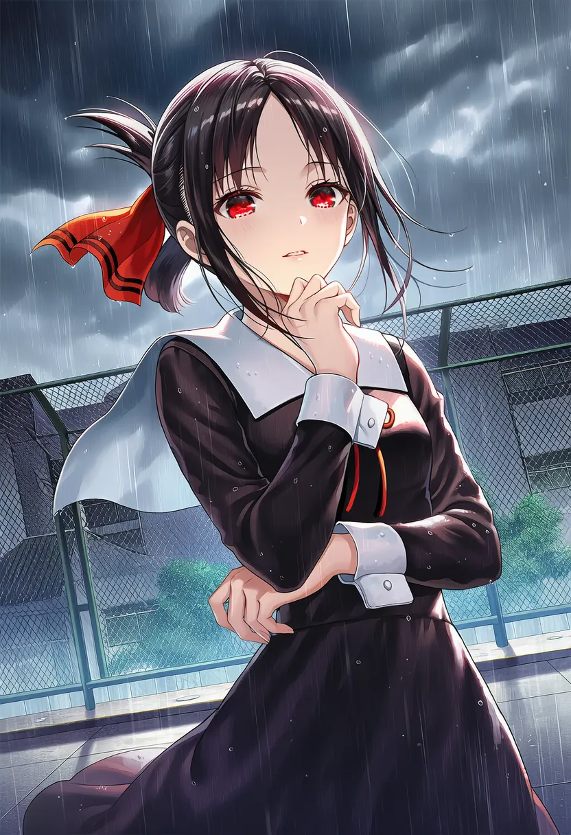 屋上で雨に打たれる冬服姿の四宮かぐや。
