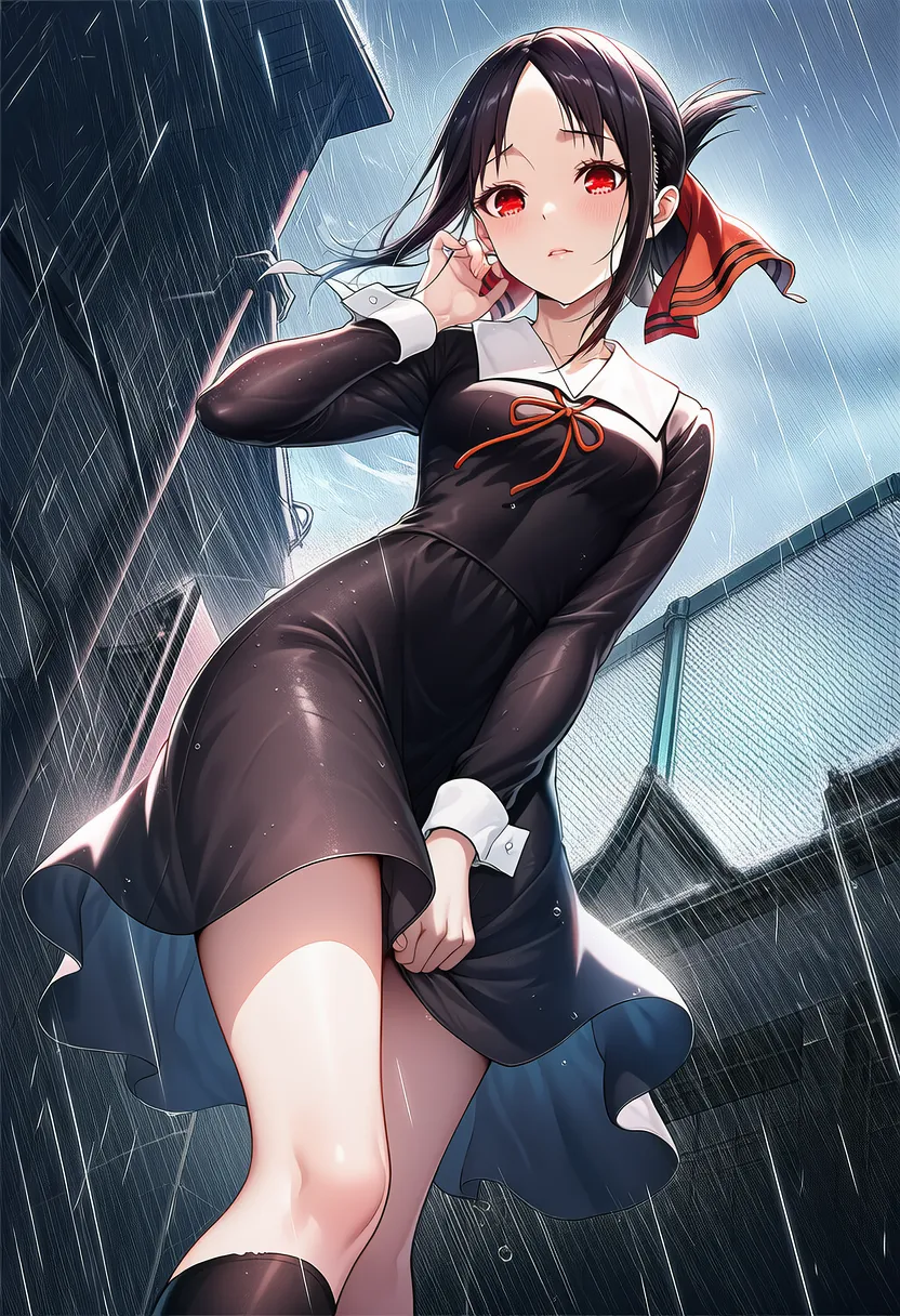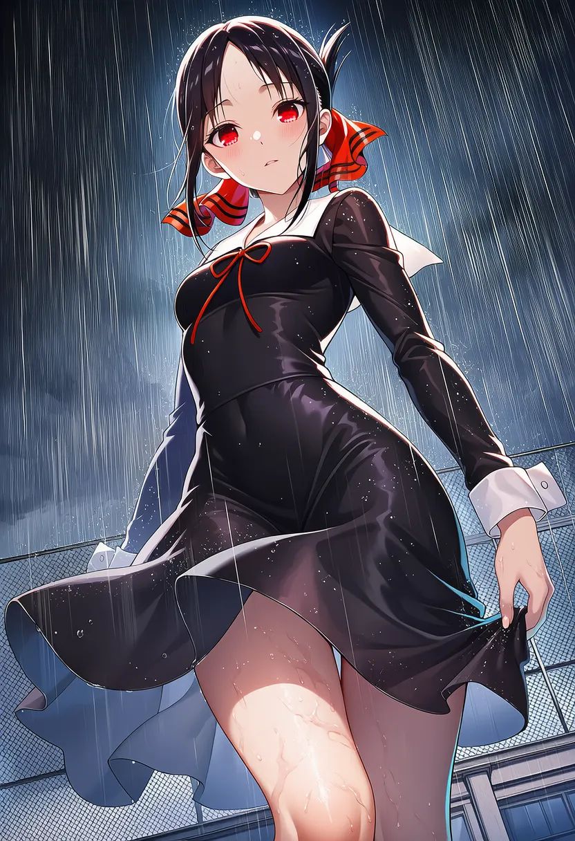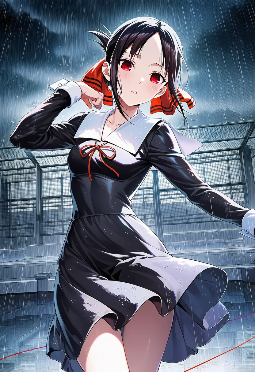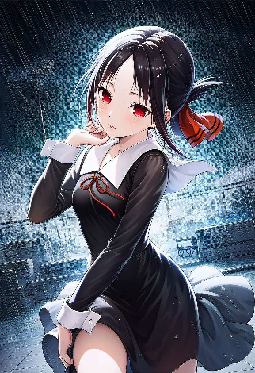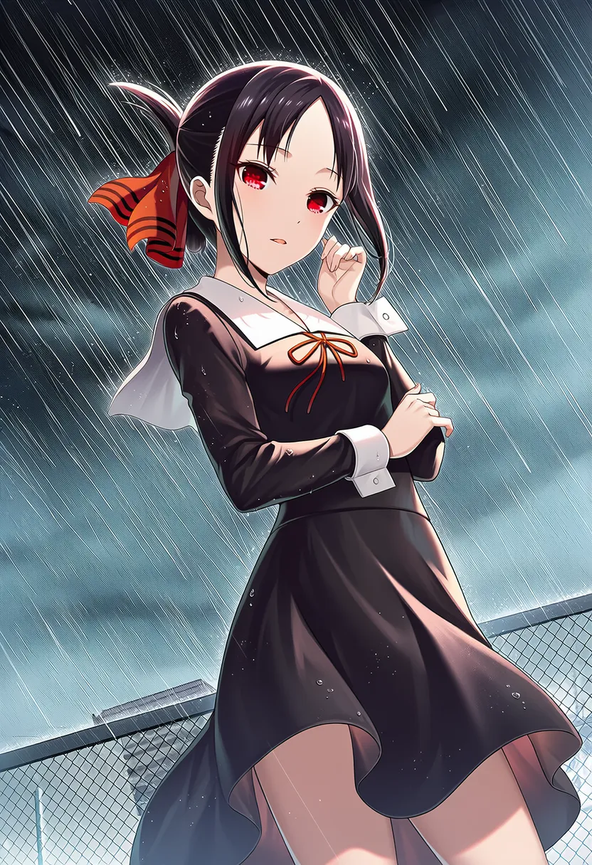 屋上で雨に打たれる冬服姿の四宮かぐや。