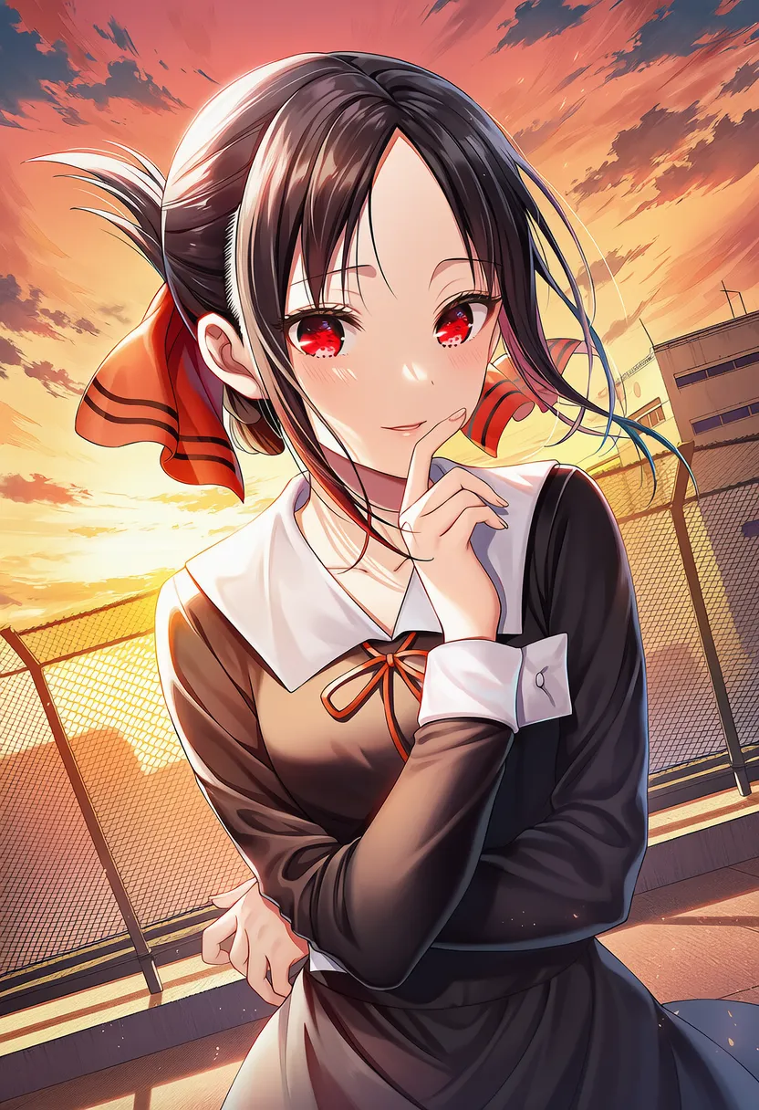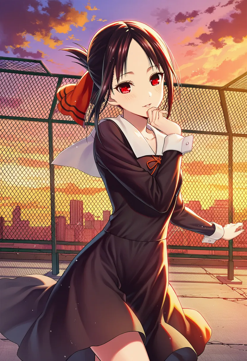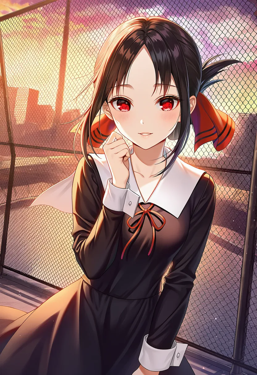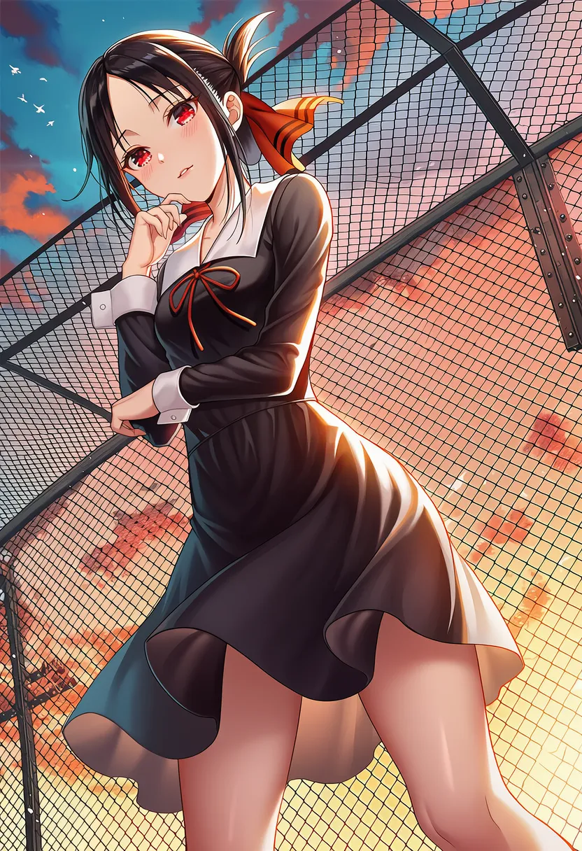 夕陽の屋上にいる冬服姿の四宮かぐや。