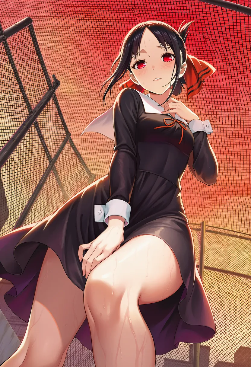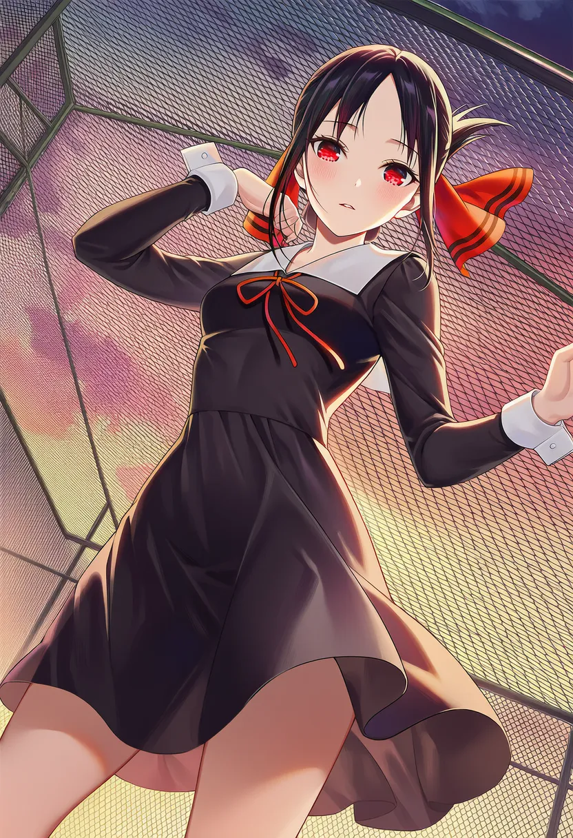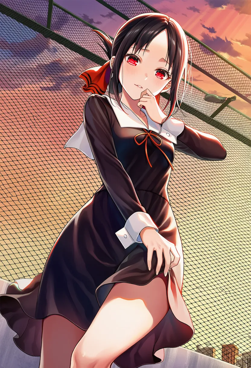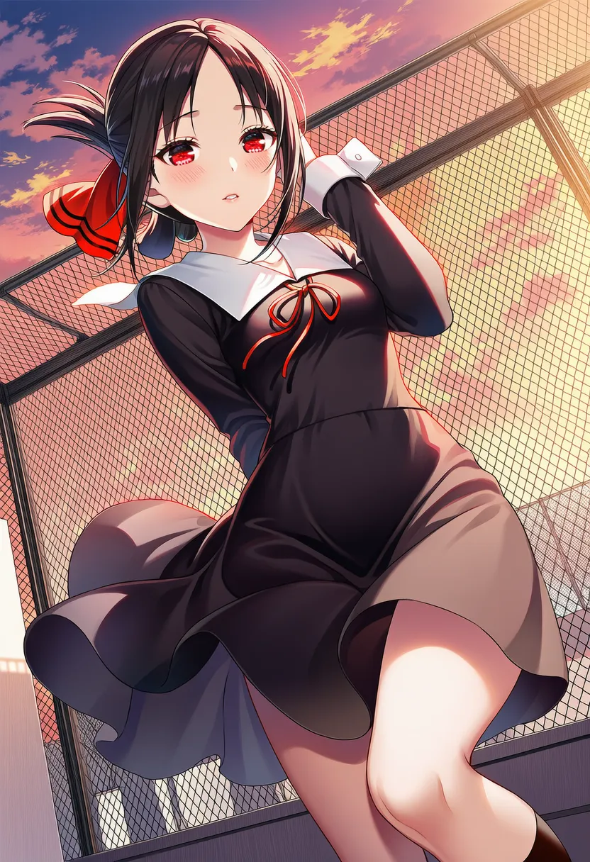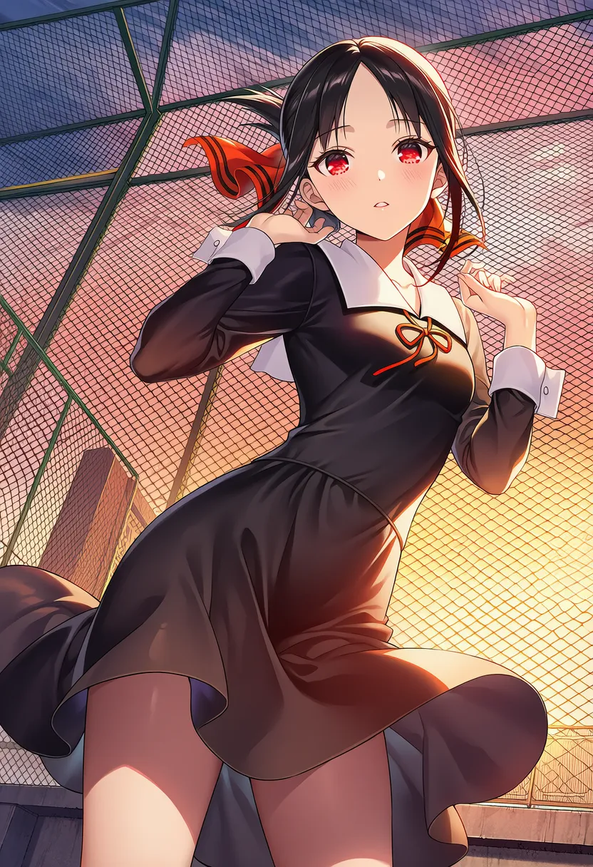 夕陽の屋上にいる冬服姿の四宮かぐや。