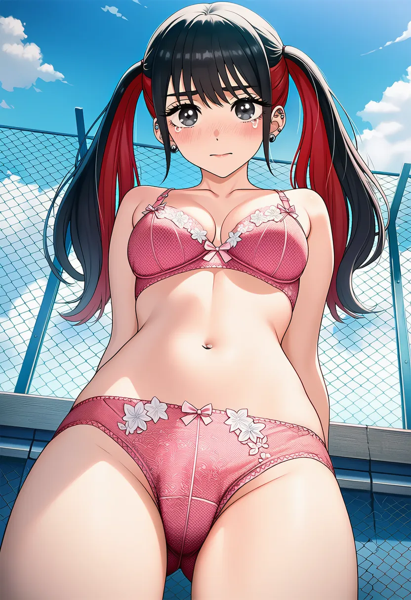 屋上で下着を露出させられる菅谷乃羽。