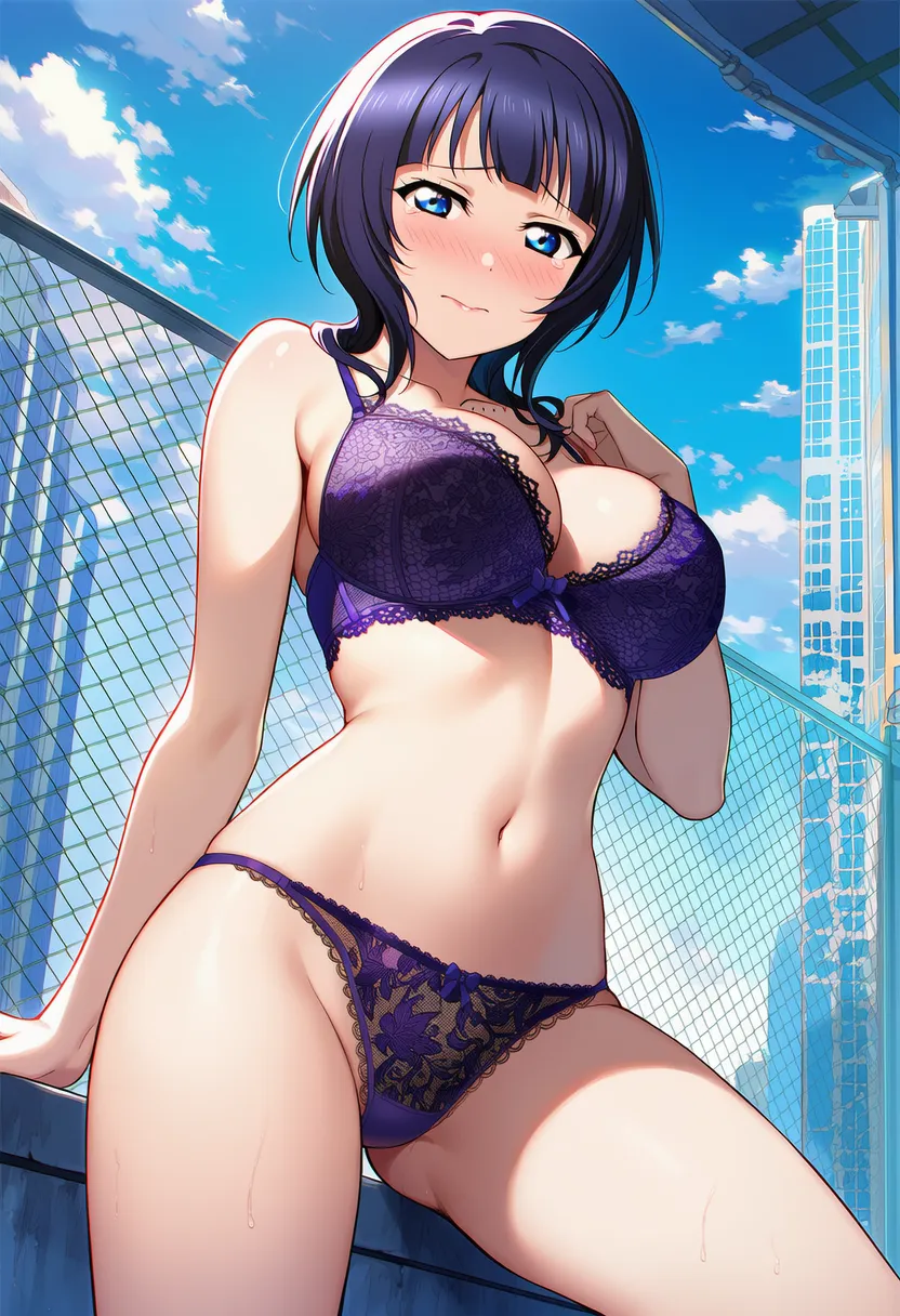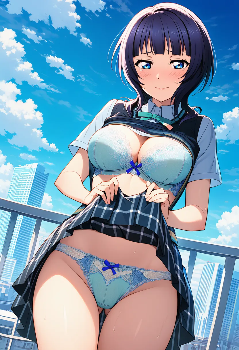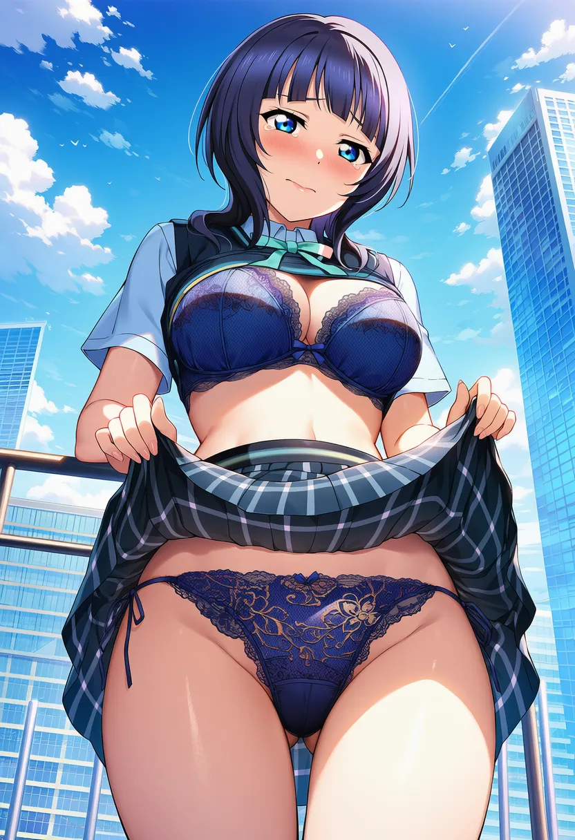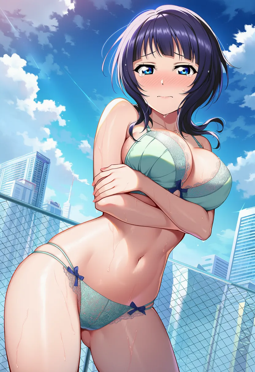 屋上で下着を露出させられる夏服姿の朝香果林。