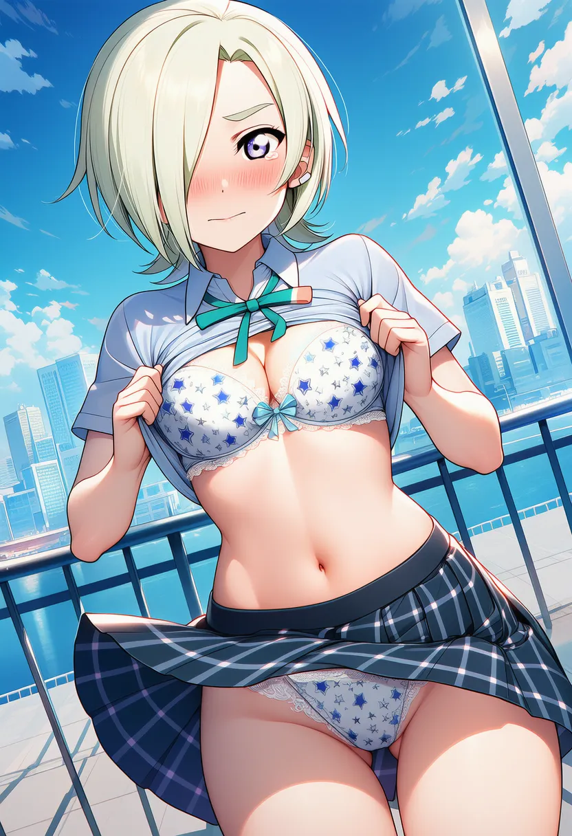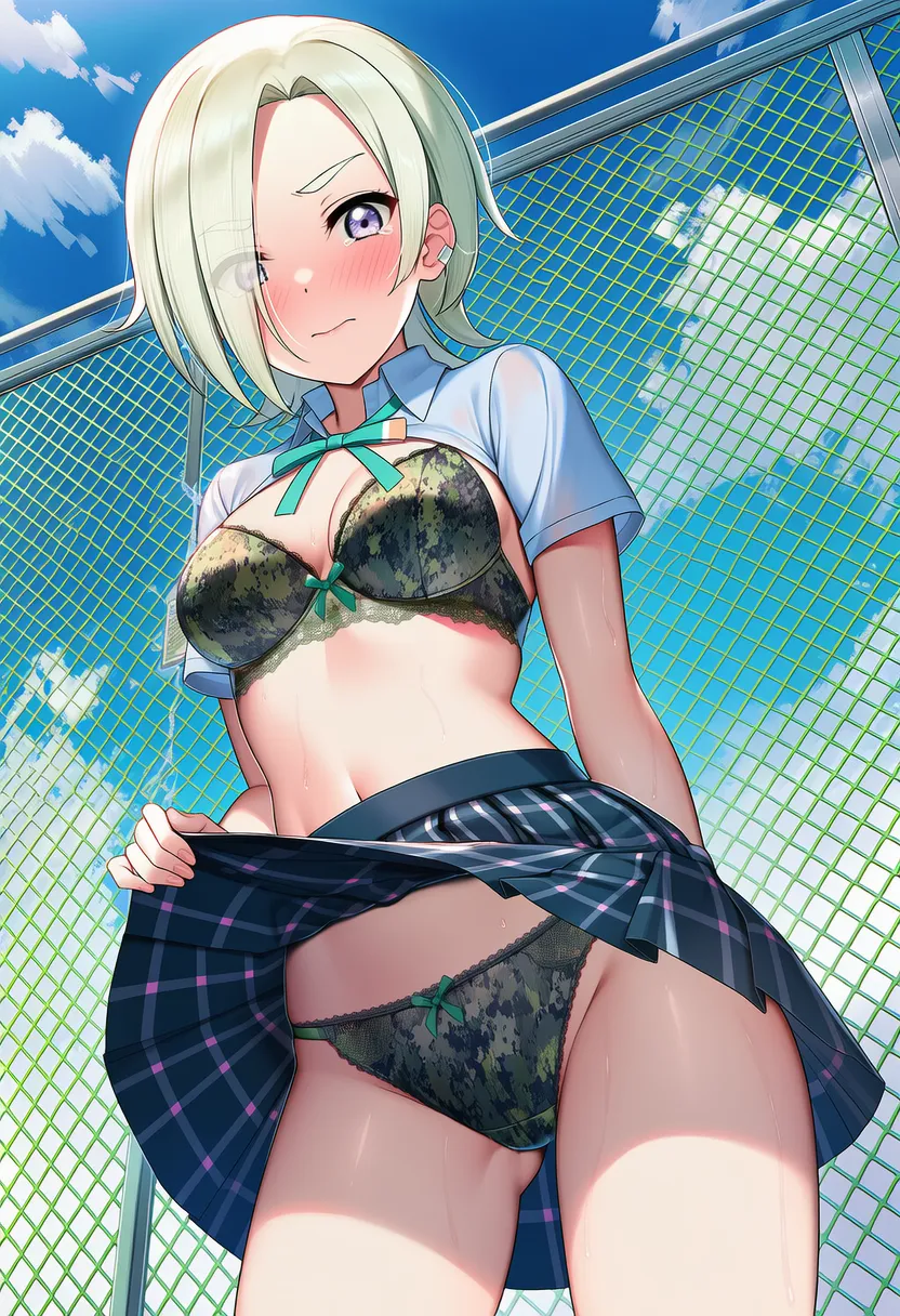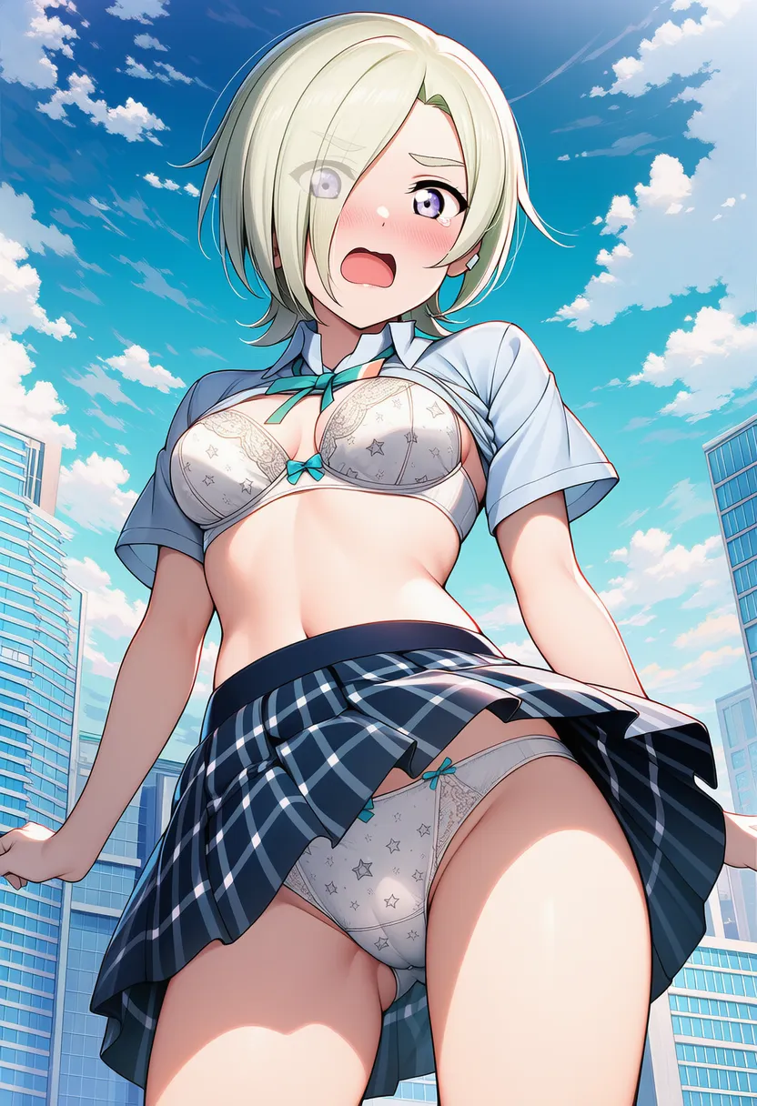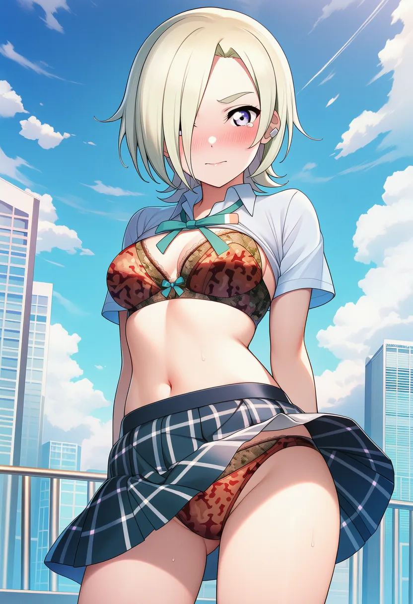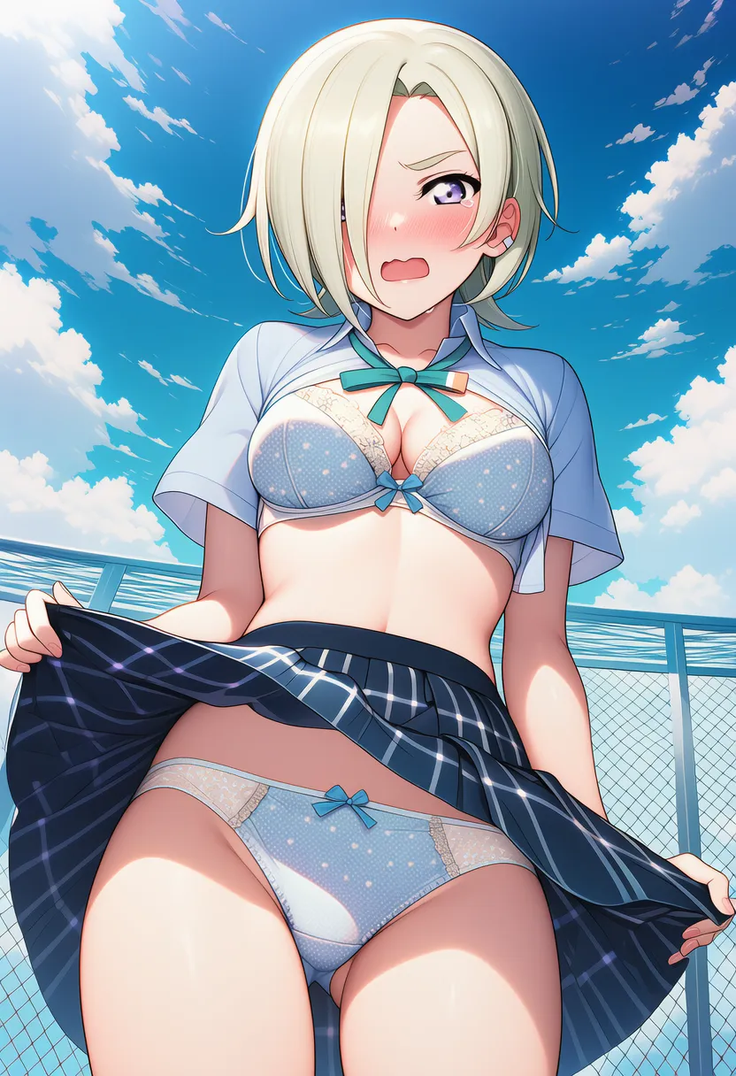 『ラブライブ!虹ヶ咲学園スクールアイドル同好会』のミア・テイラー(ショウ・ランジュ)の下着露出イラストです。pixivでは「下着チェック」シリーズとして投稿している内容です。クリック/タップで大きな画像を表示できます。