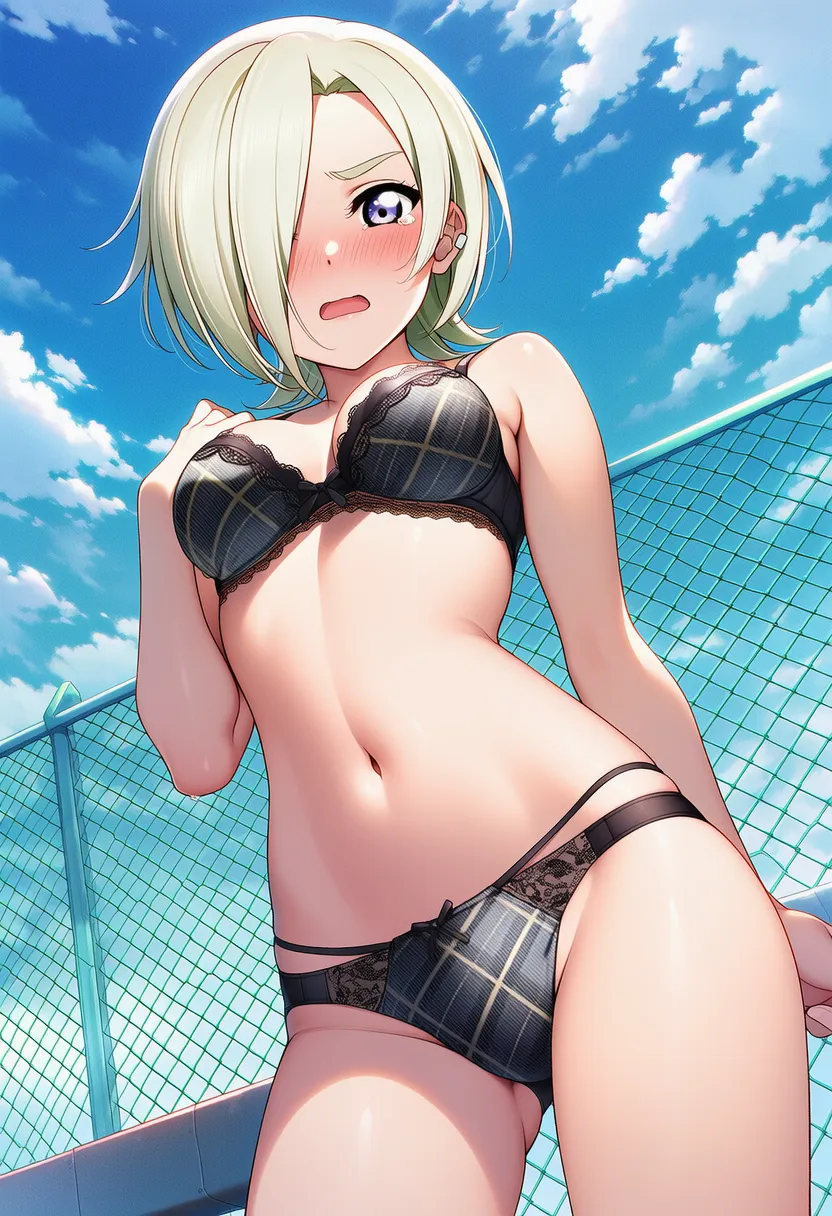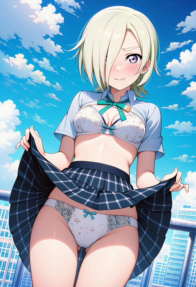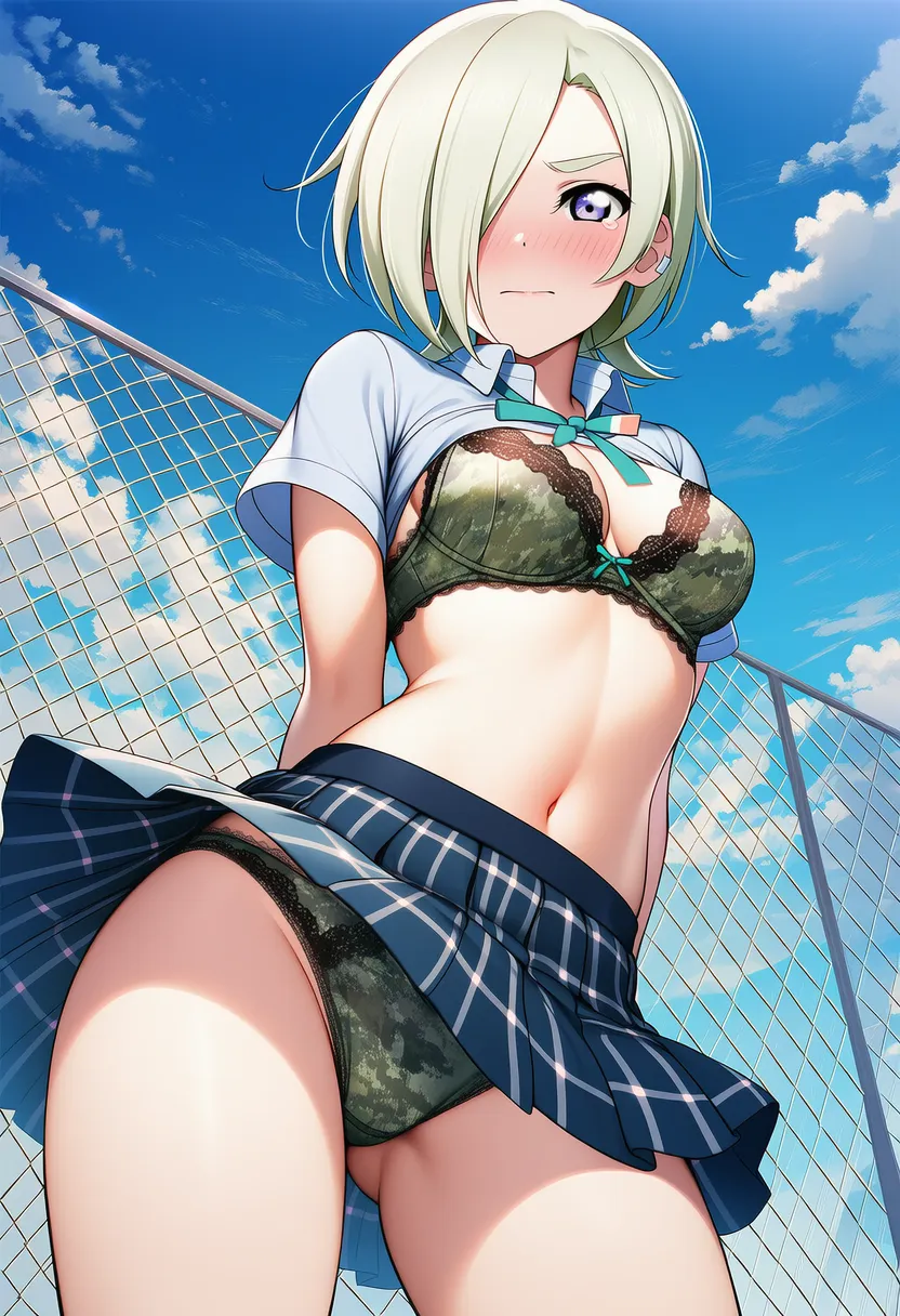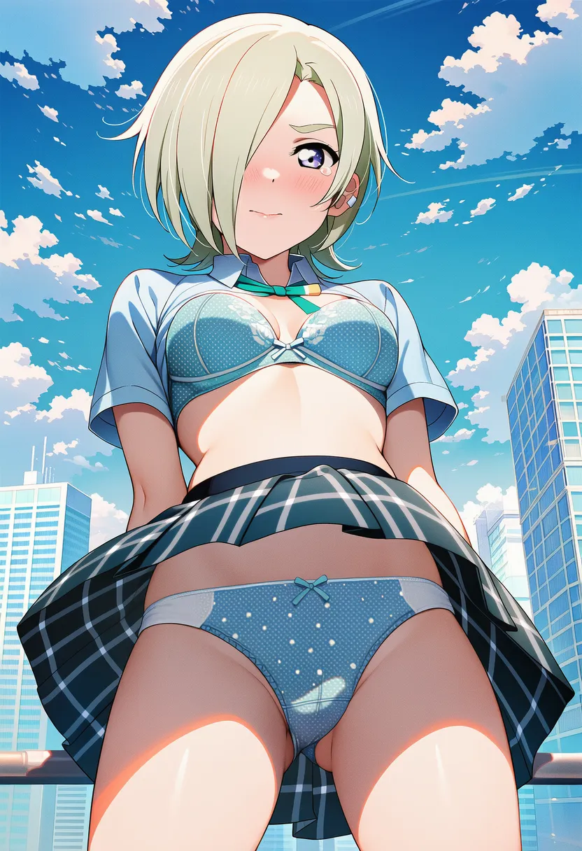 『ラブライブ!虹ヶ咲学園スクールアイドル同好会』のミア・テイラー(ショウ・ランジュ)の下着露出イラストです。pixivでは「下着チェック」シリーズとして投稿している内容です。クリック/タップで大きな画像を表示できます。