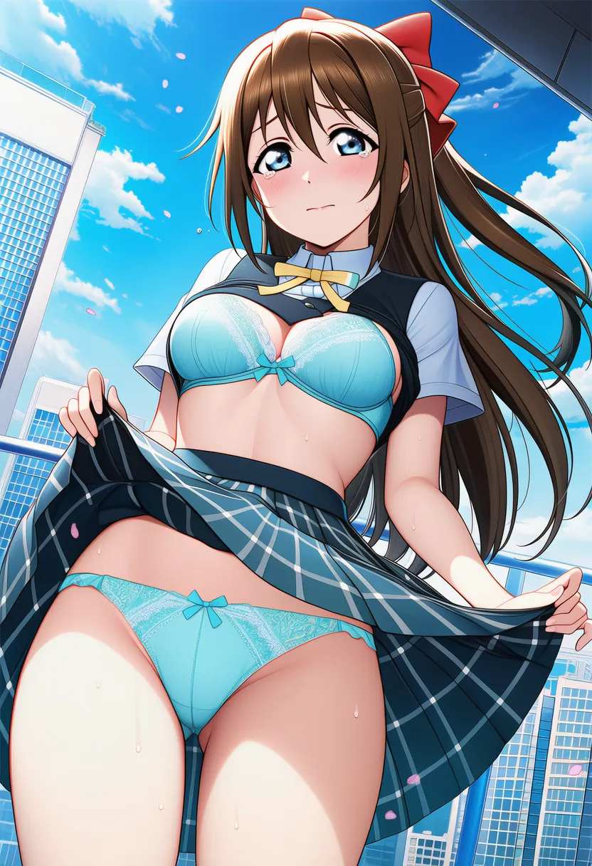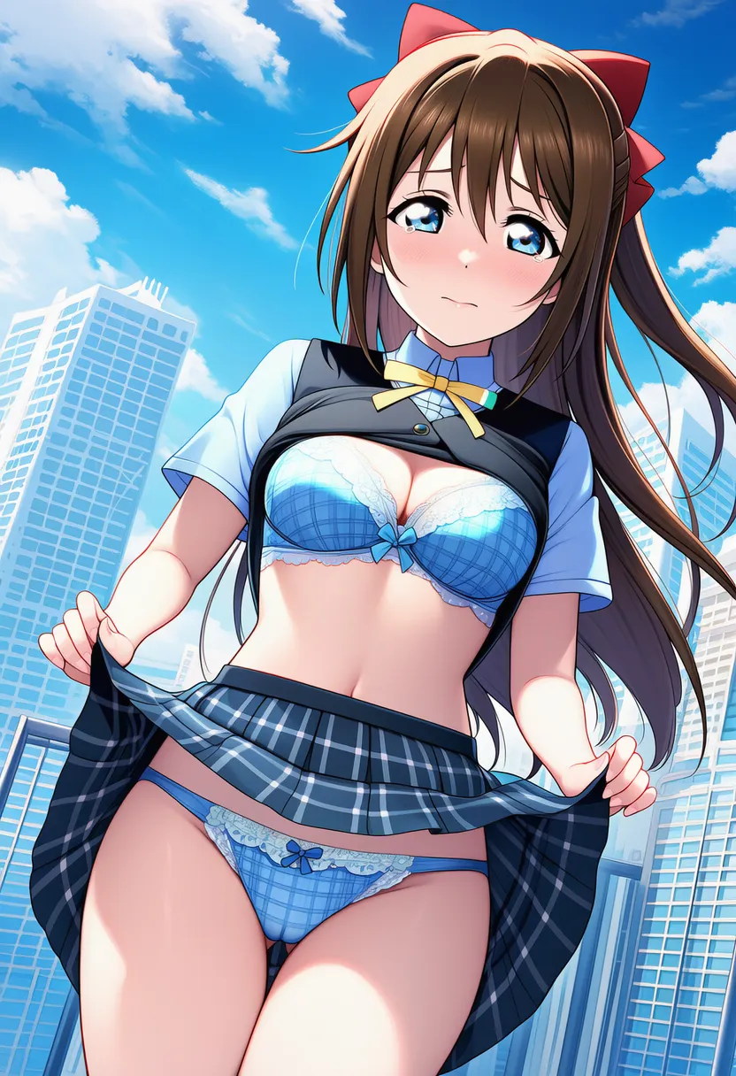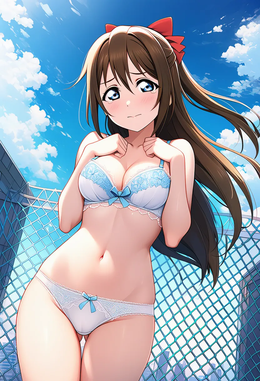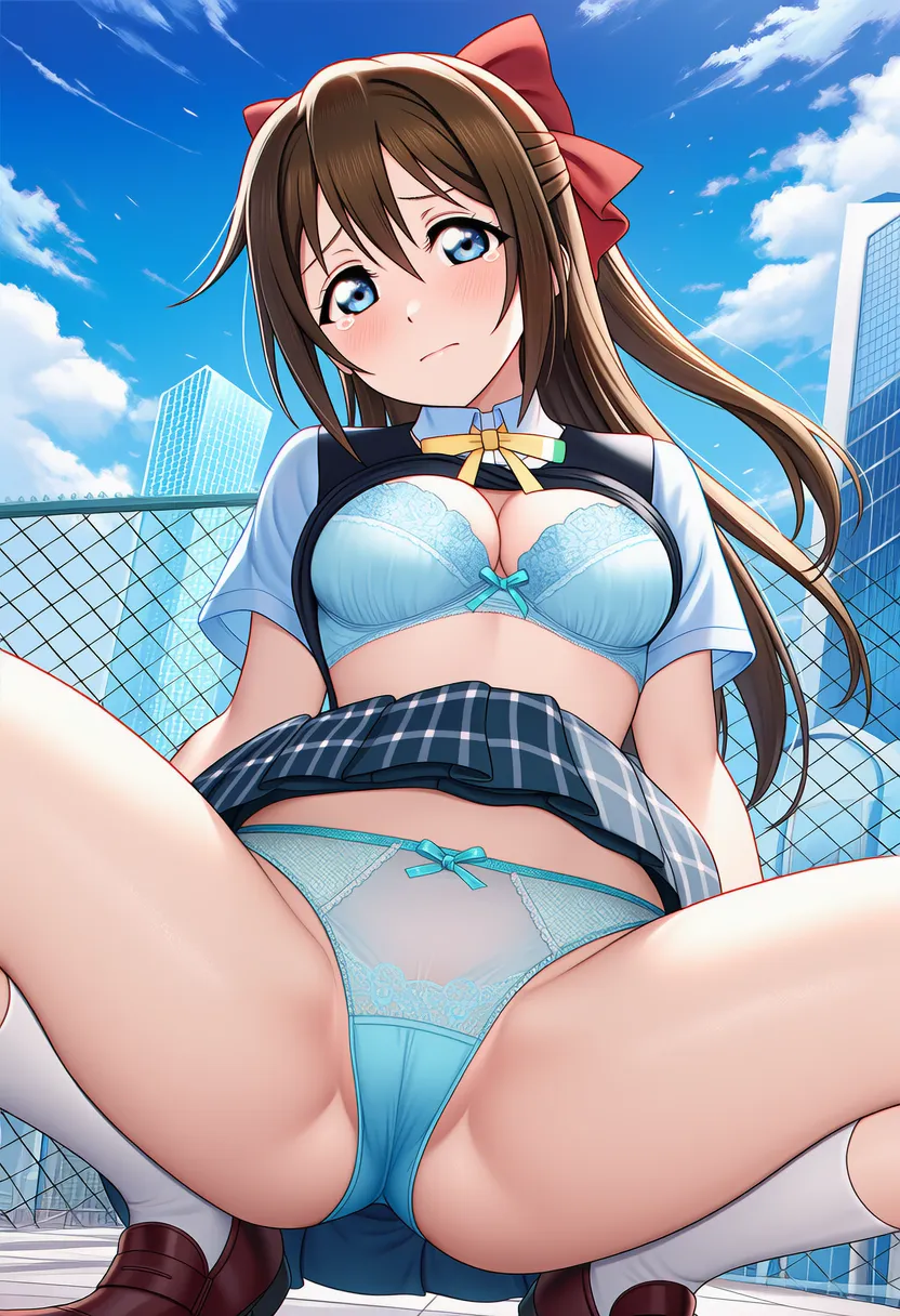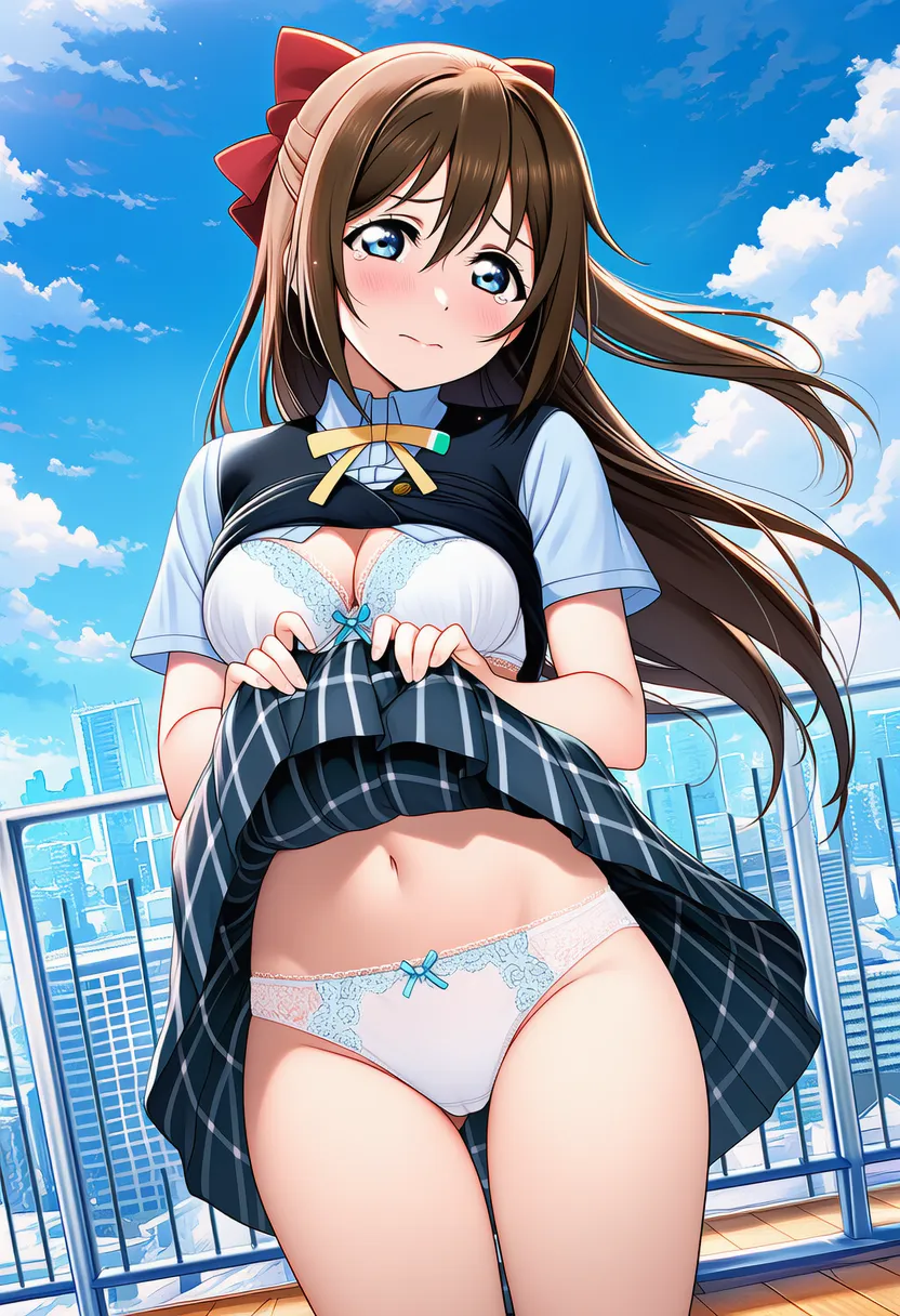 屋上で下着を露出させられる夏服姿の桜坂しずく。