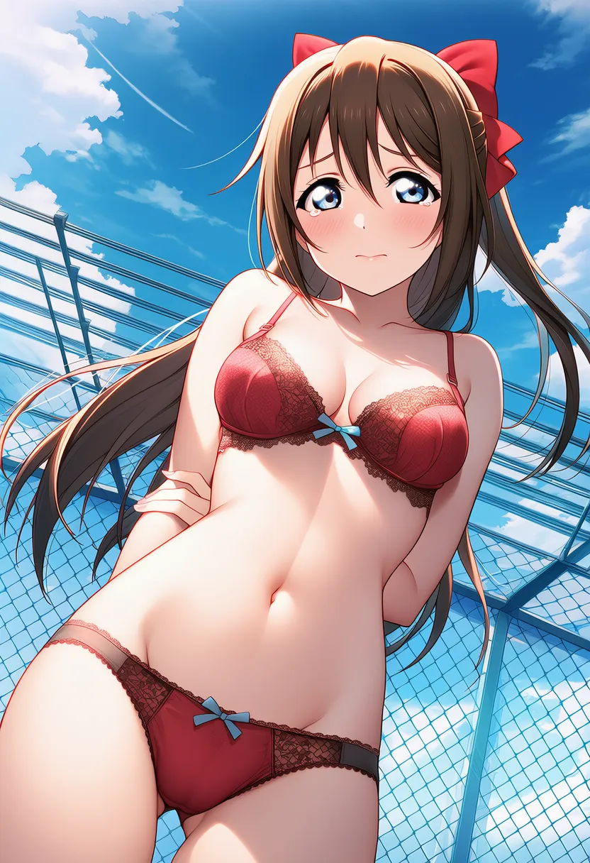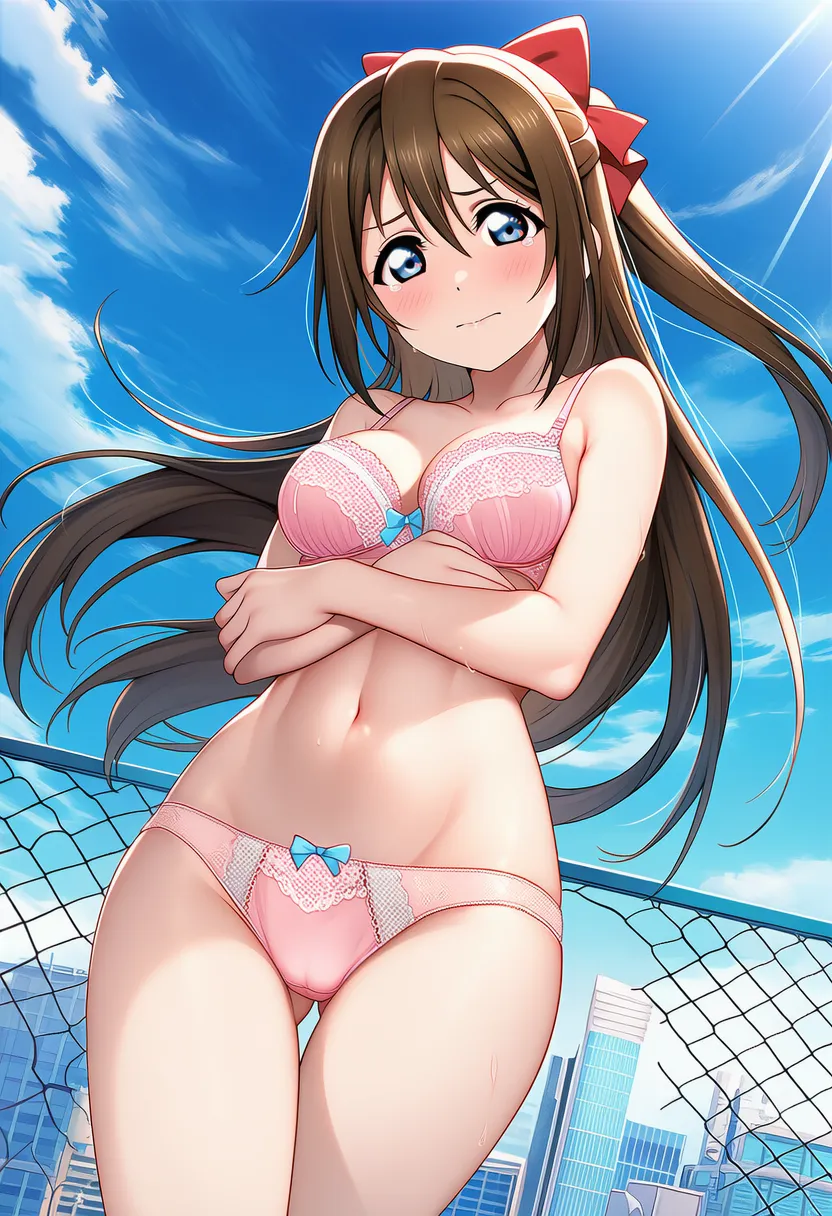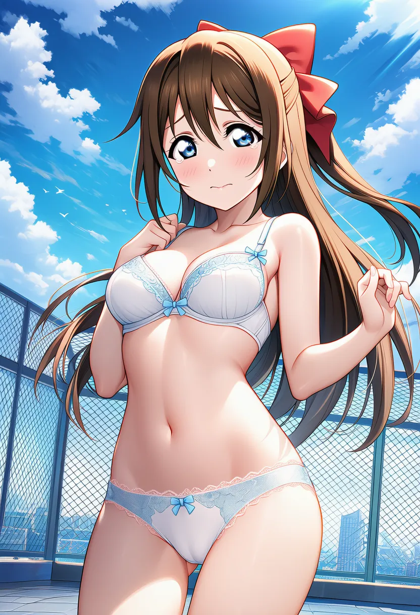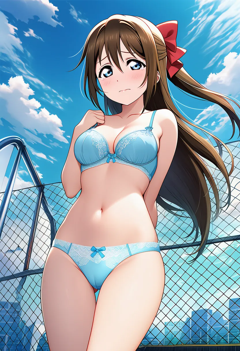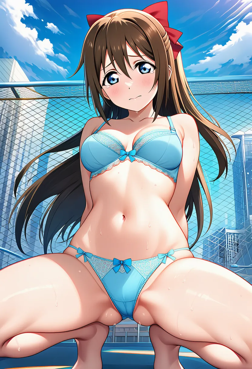 屋上で下着を露出させられる夏服姿の桜坂しずく。