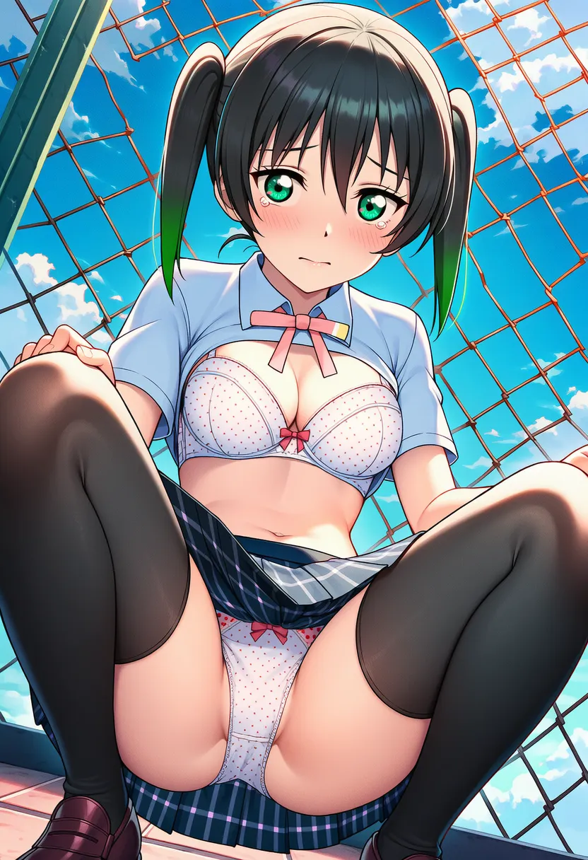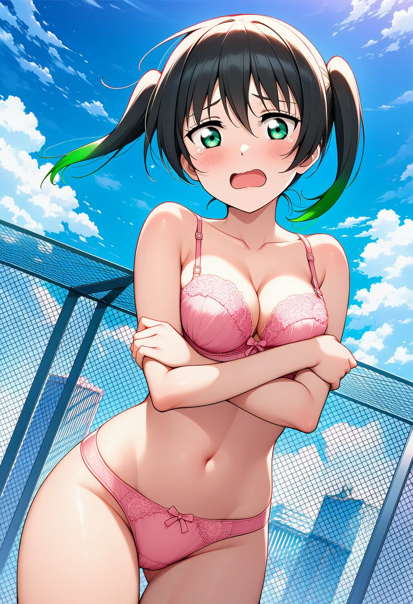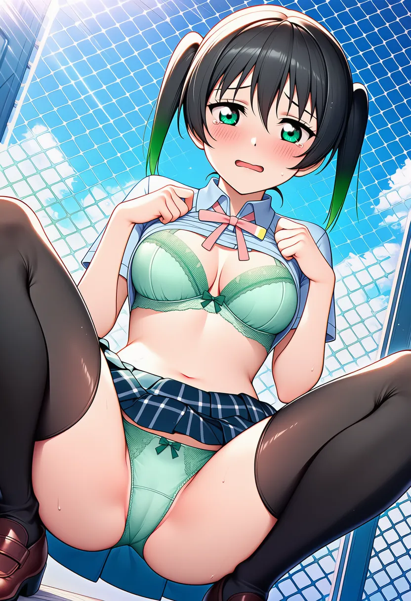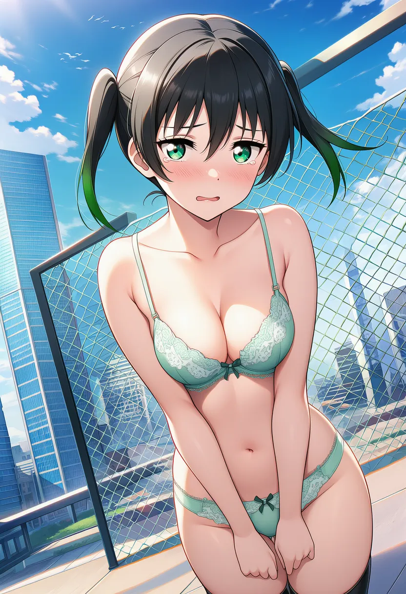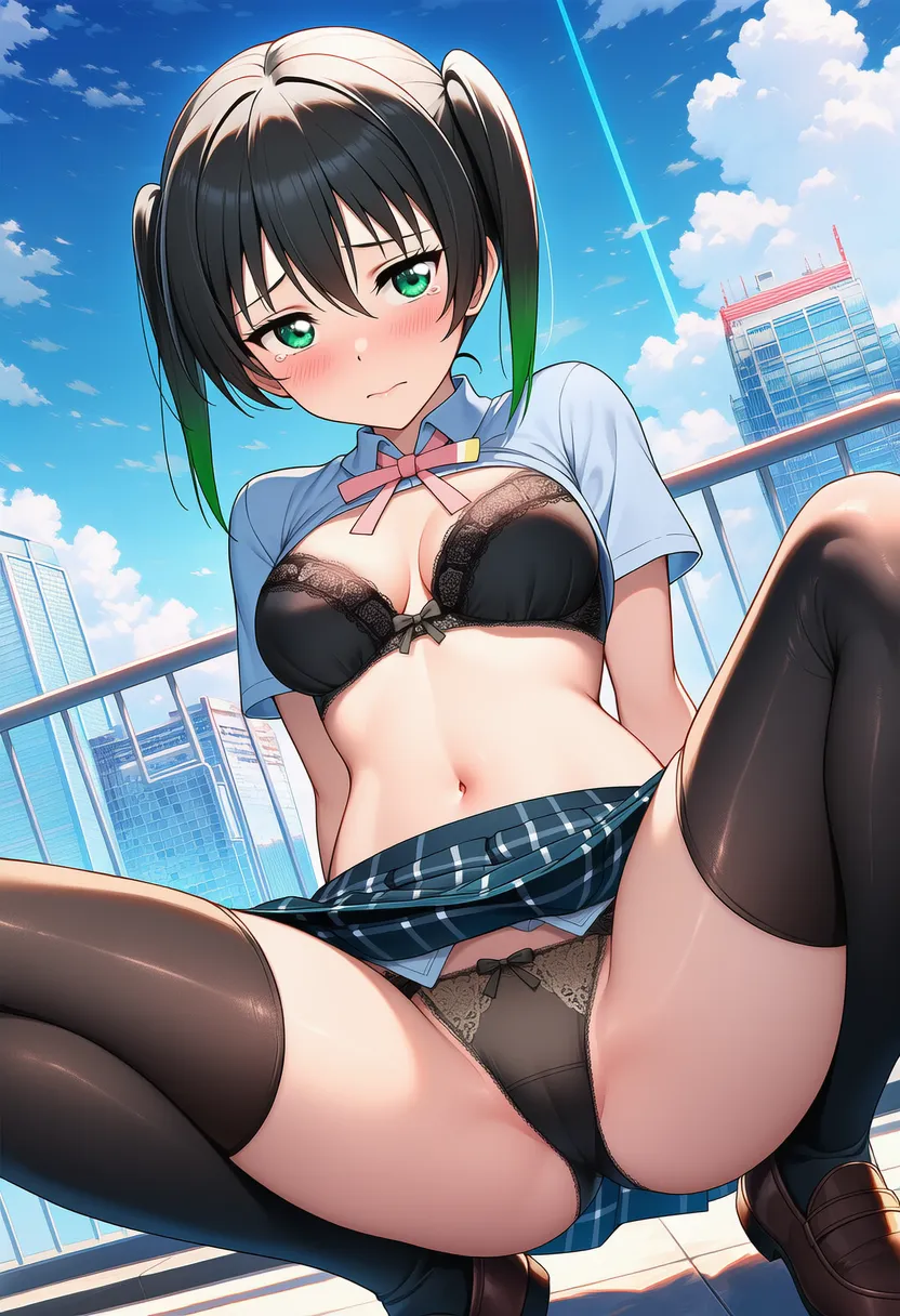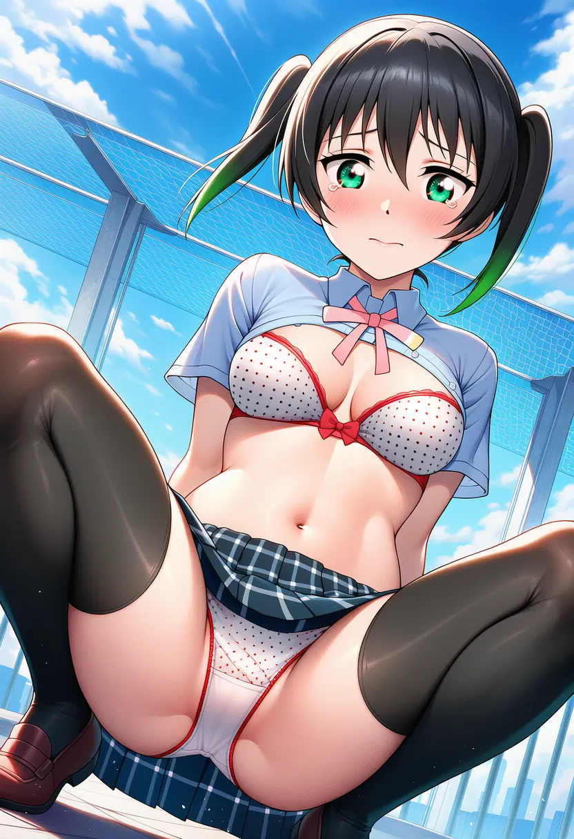屋上で下着を露出させられる夏服姿の高咲侑。