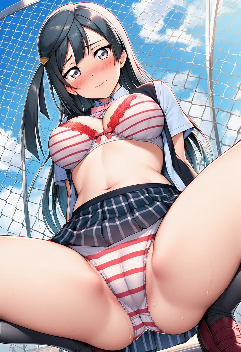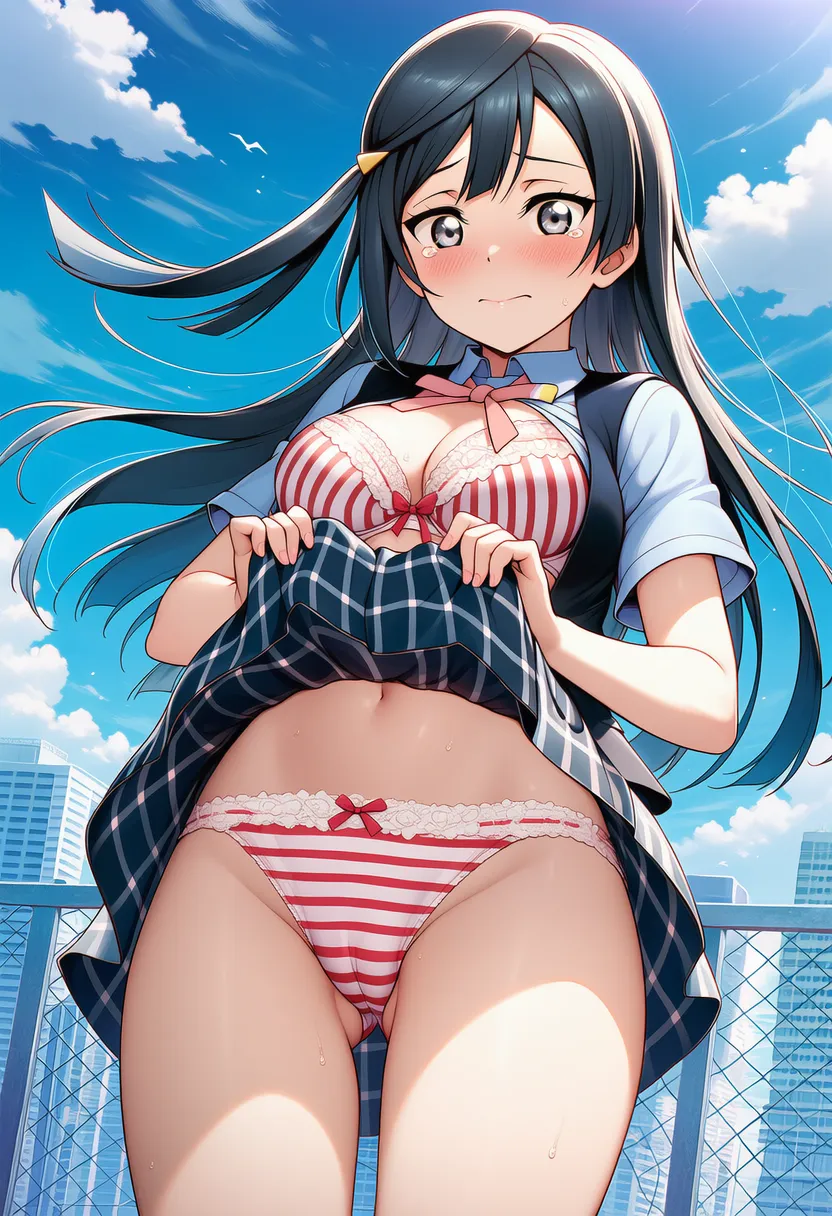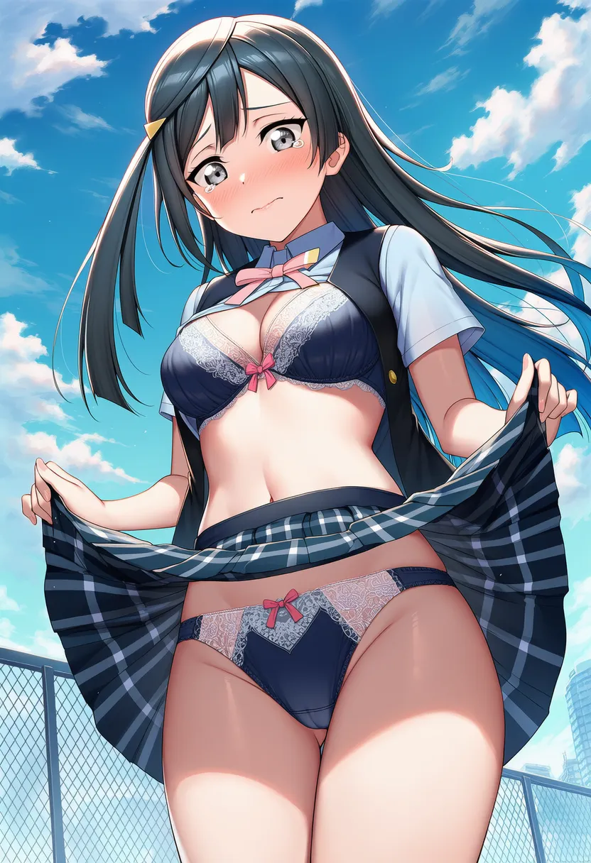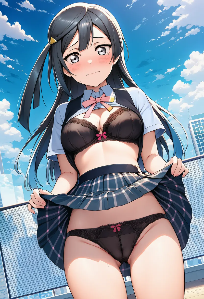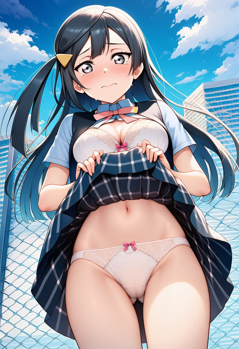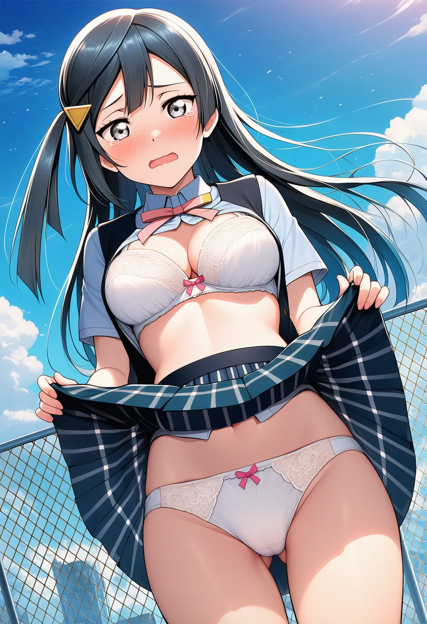 屋上で下着を露出させられる夏服姿の優木せつ菜。