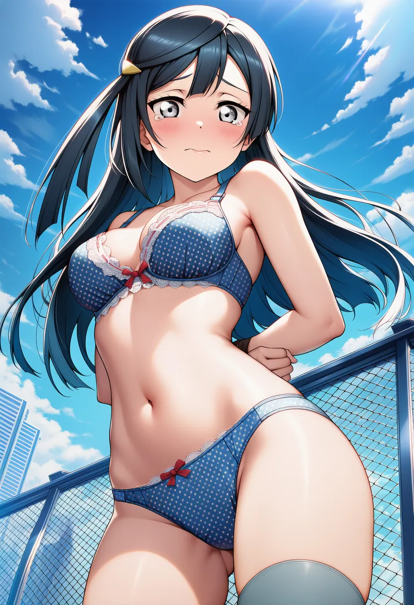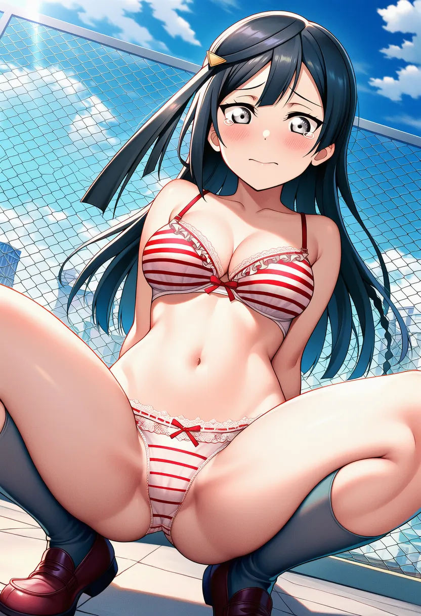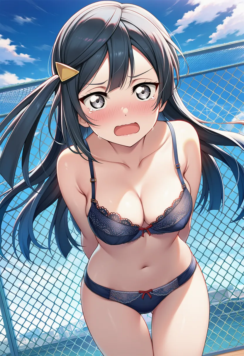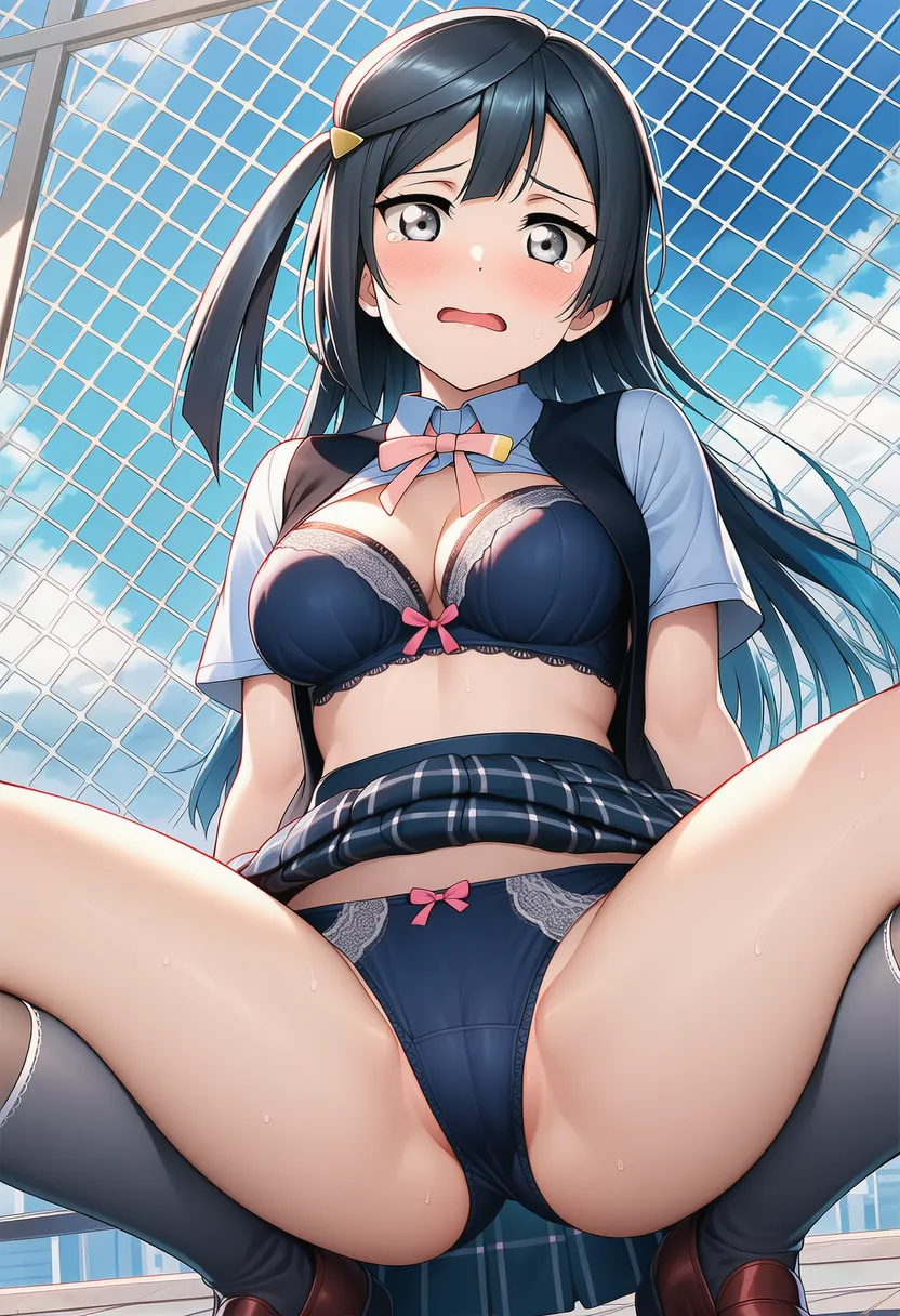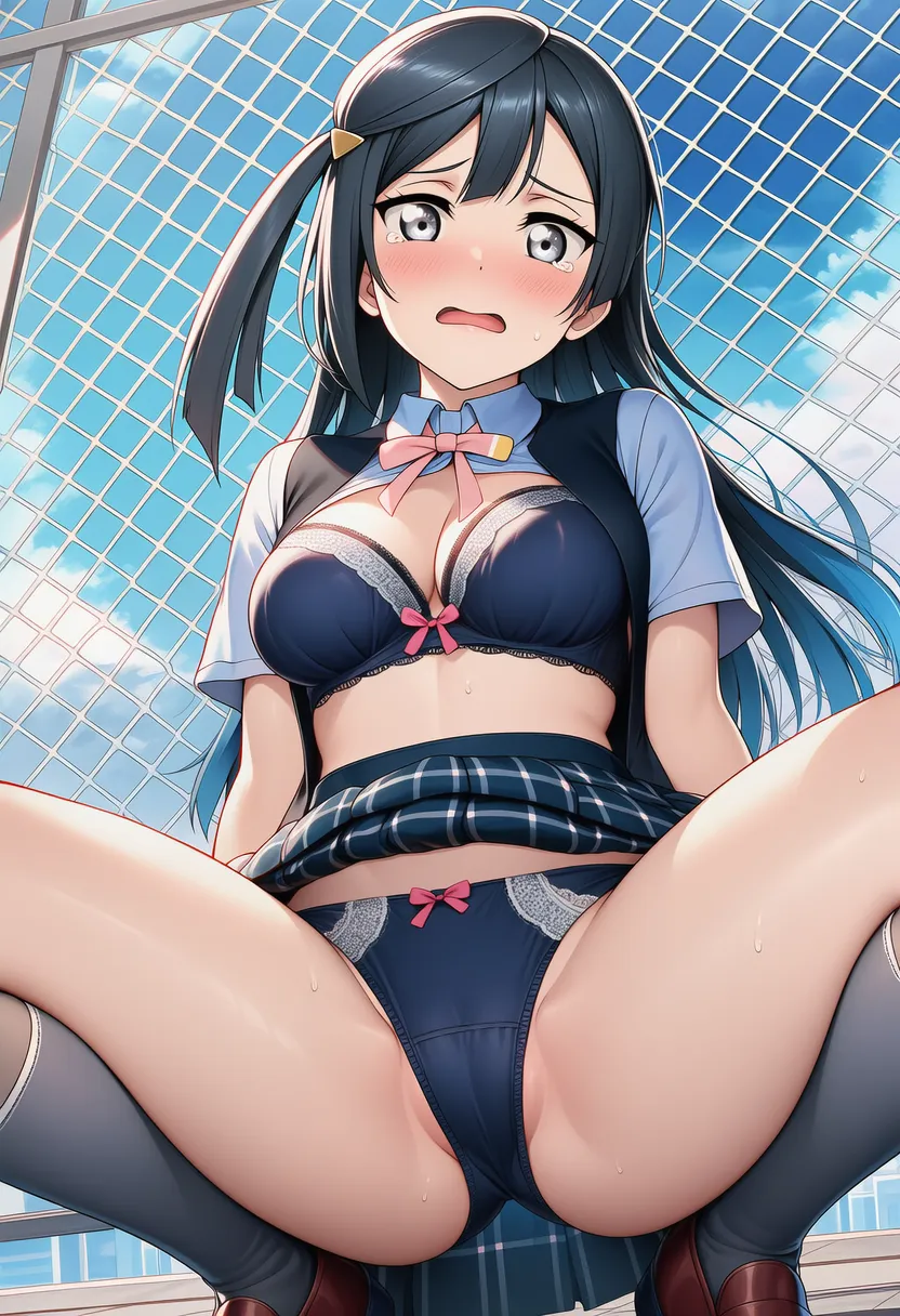 屋上で下着を露出させられる夏服姿の優木せつ菜。