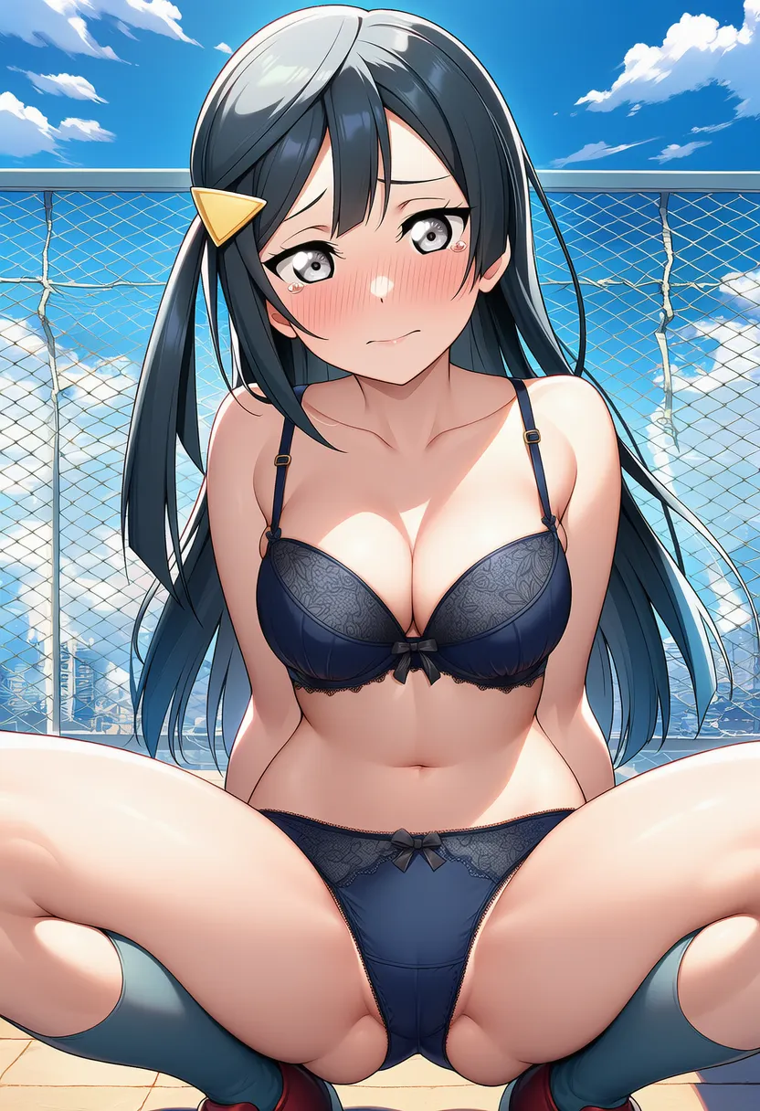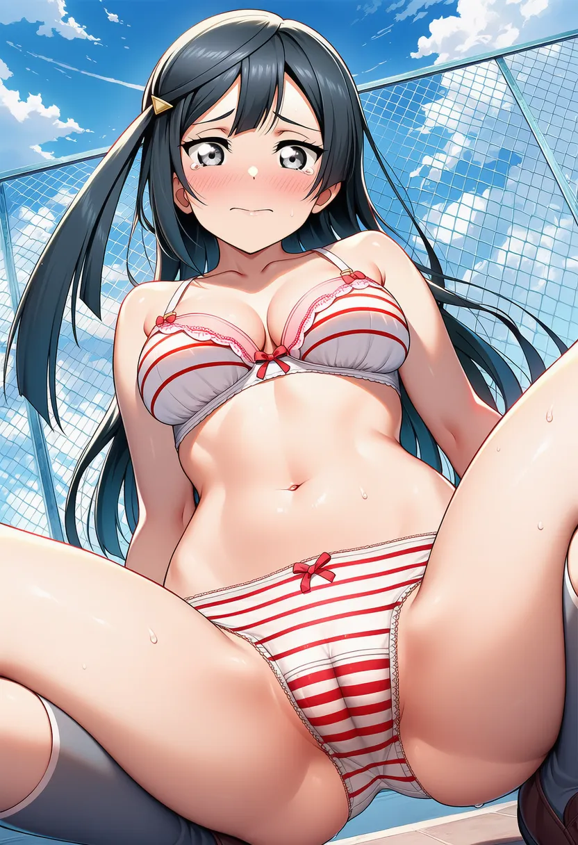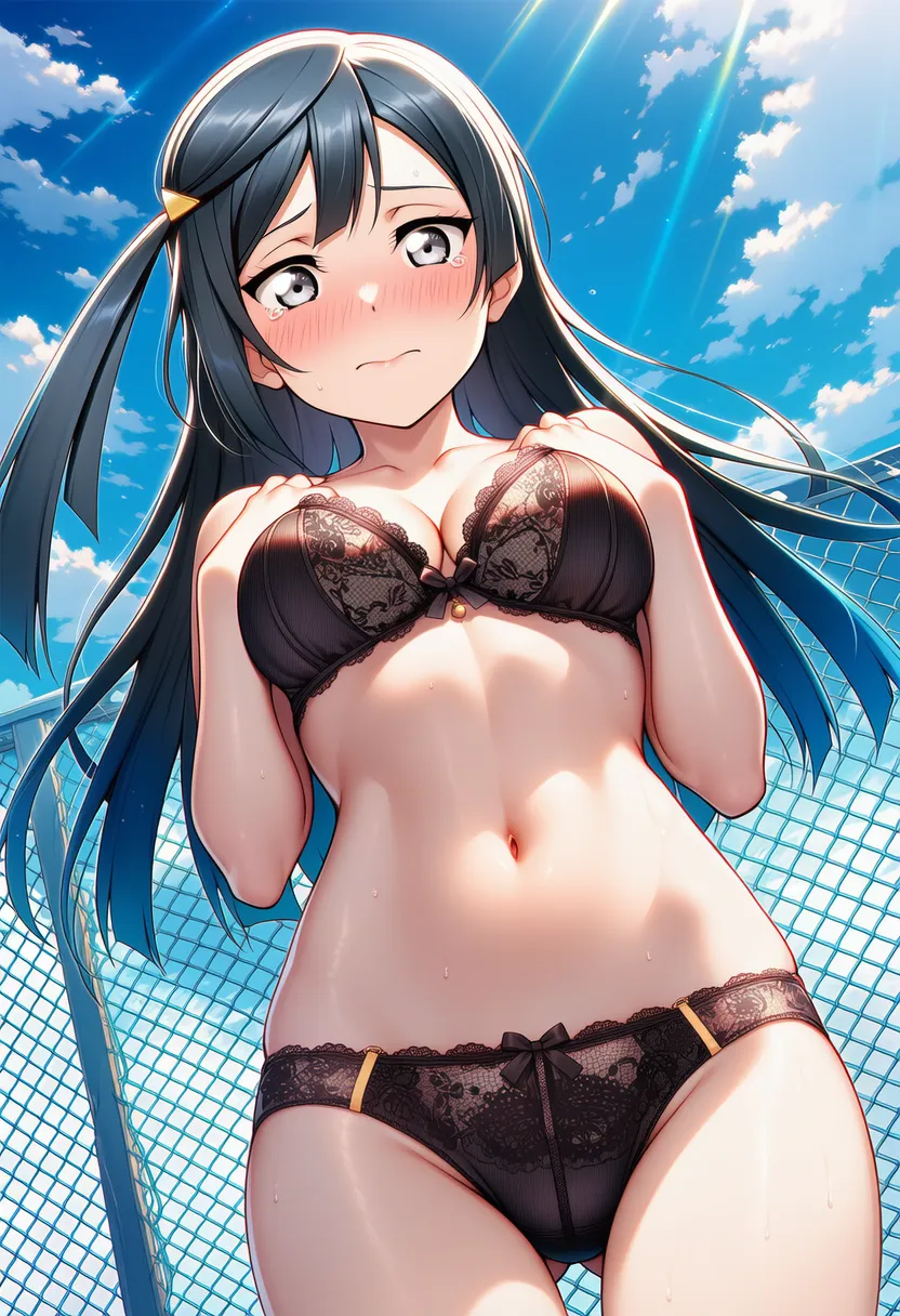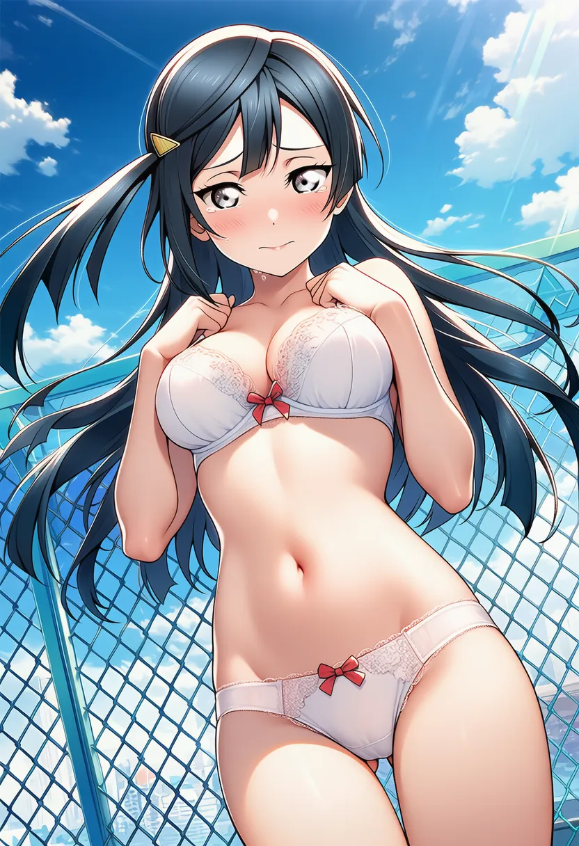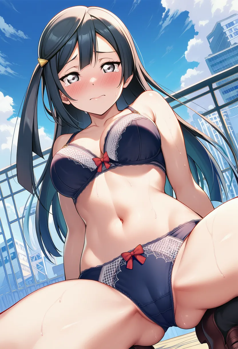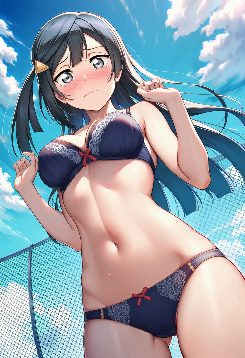 屋上で下着を露出させられる夏服姿の優木せつ菜。