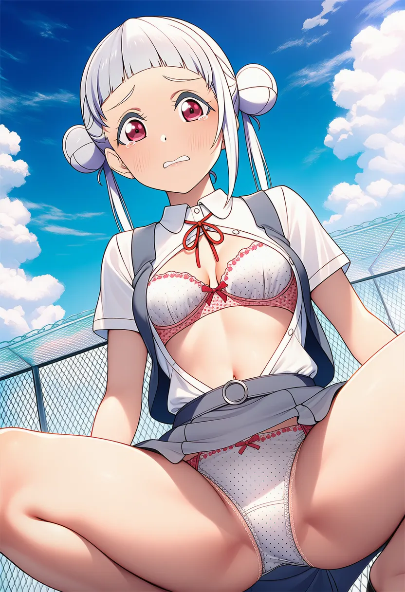 屋上で下着を露出させられる夏服姿の嵐千砂都。