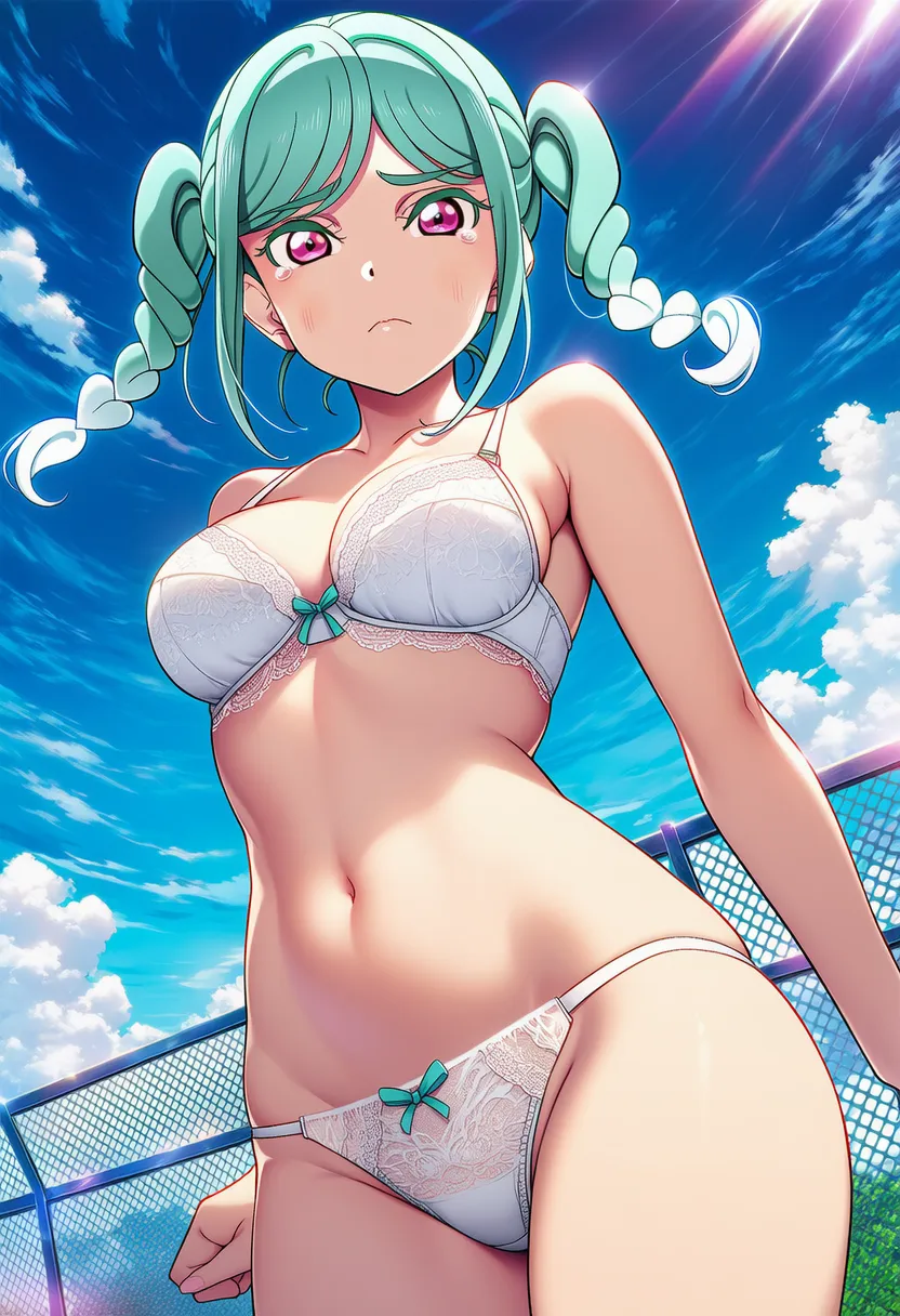屋上で下着を露出させられる夏服姿の鬼塚冬毬。