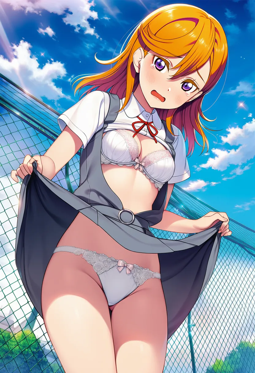 屋上で下着を露出させられる夏服姿の澁谷かのん。