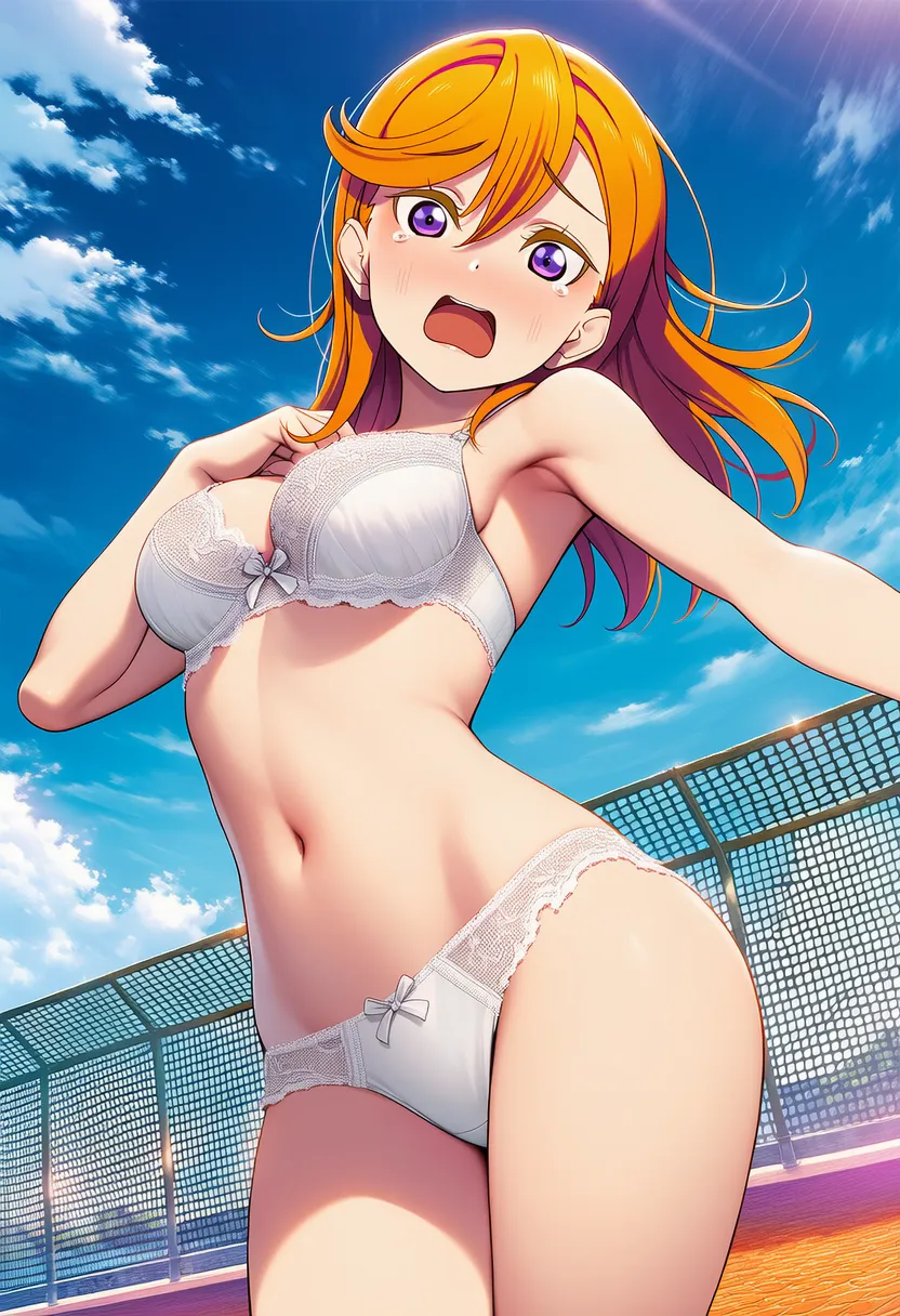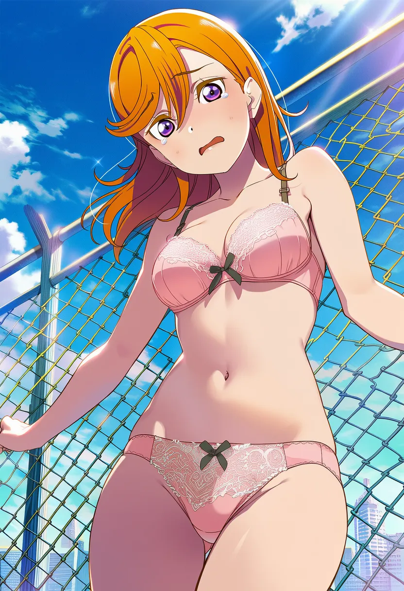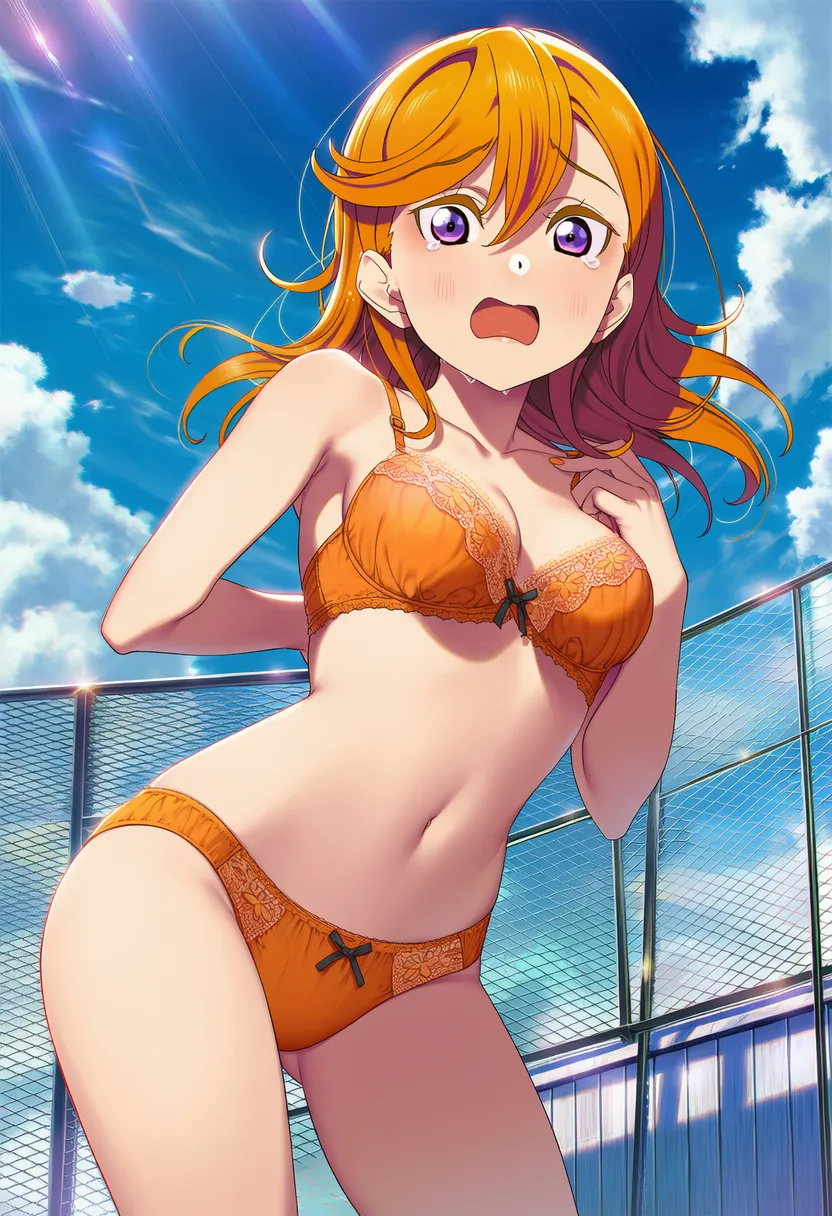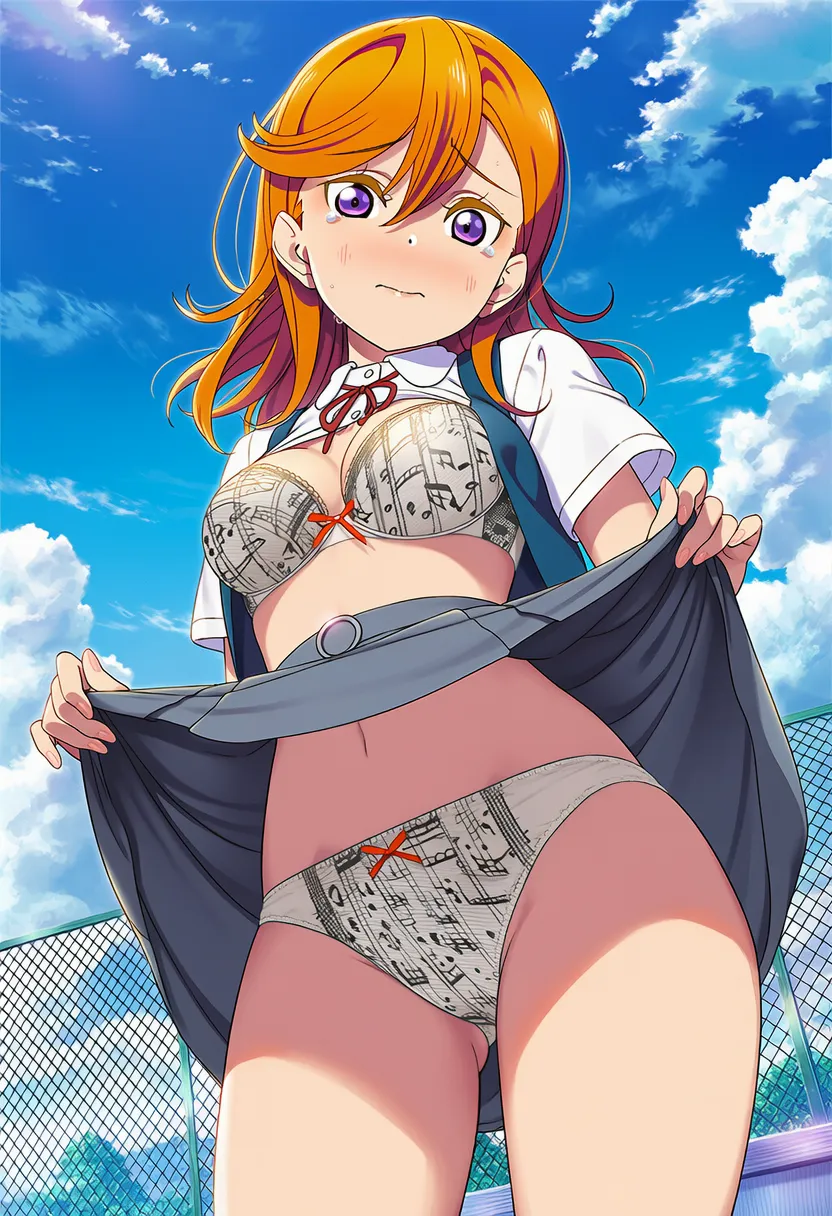 屋上で下着を露出させられる澁谷かのん。