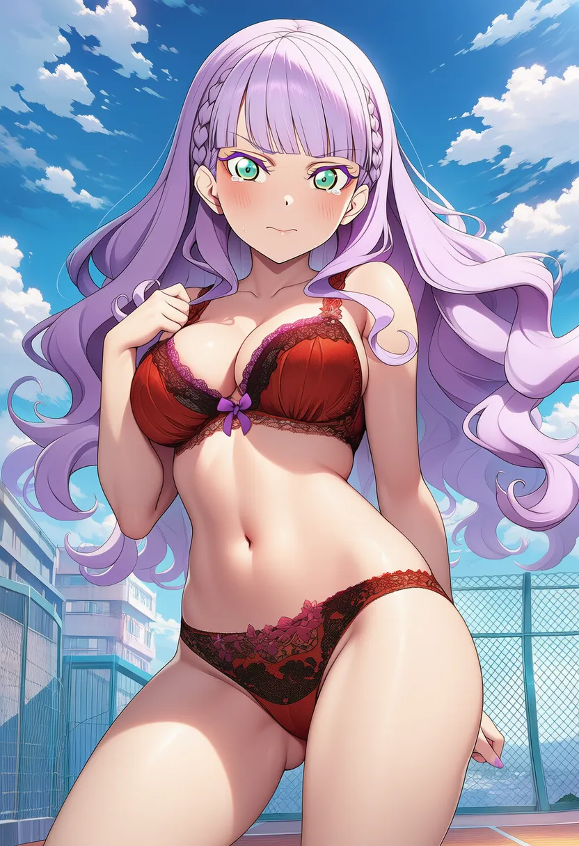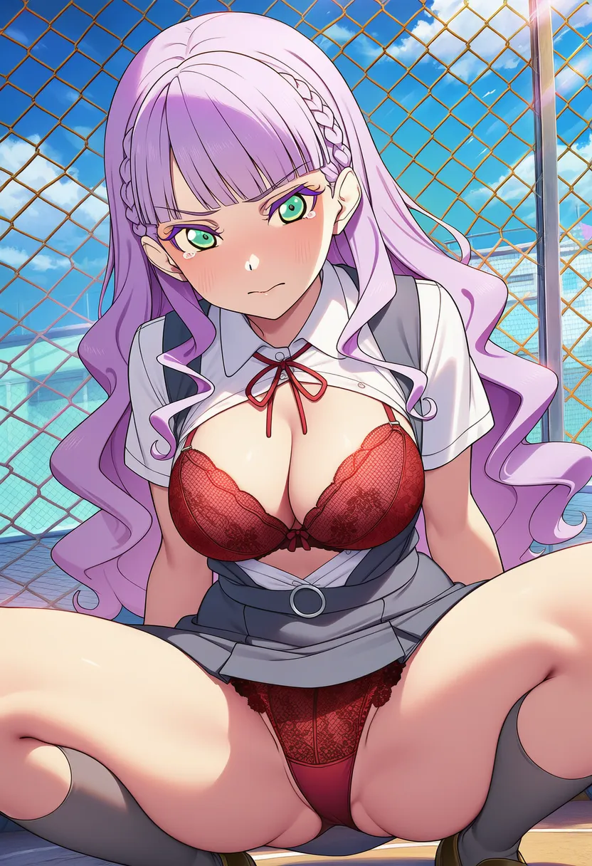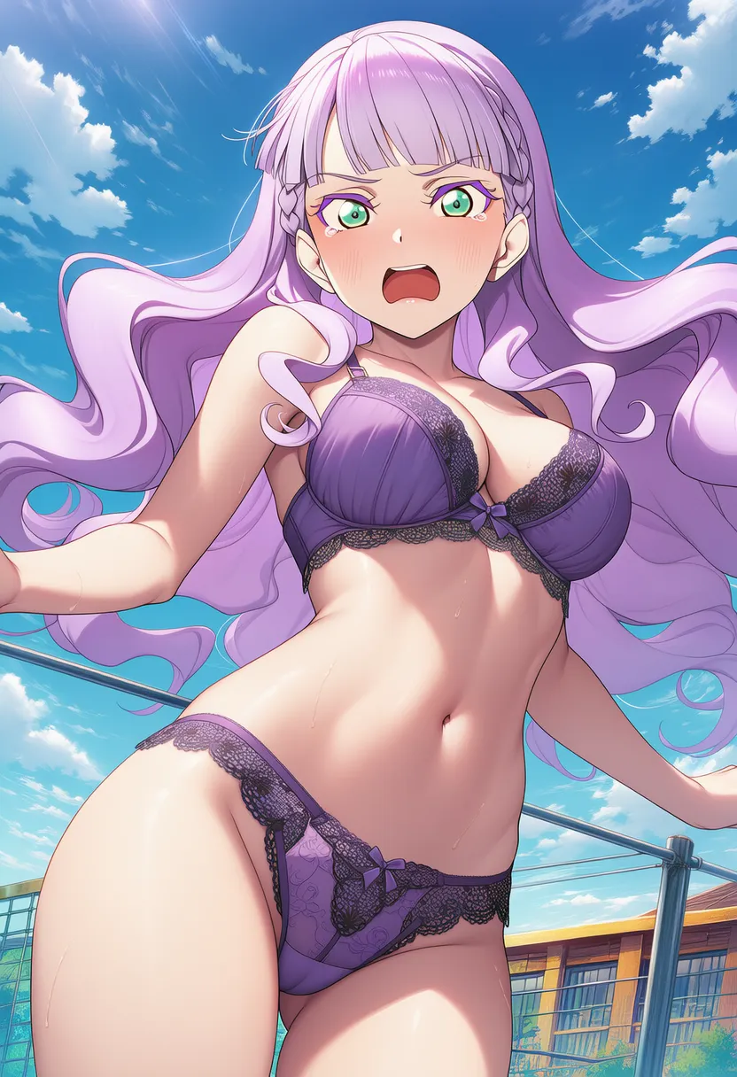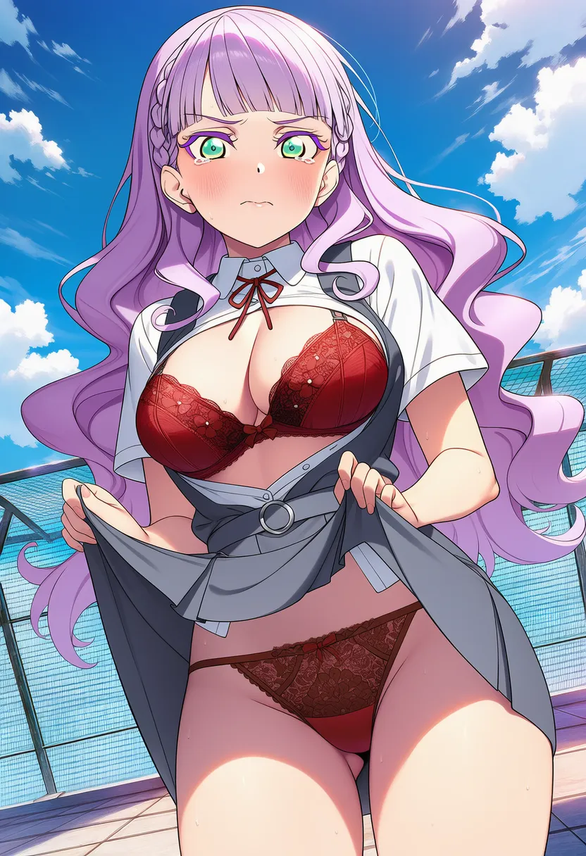 屋上で下着を露出させられる夏服姿のウィーン・マルガレーテ。